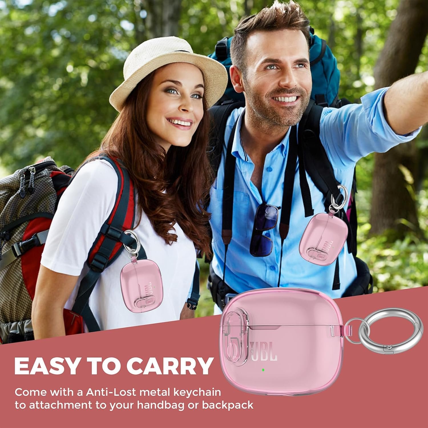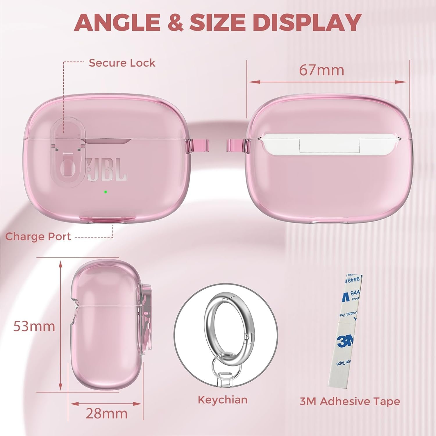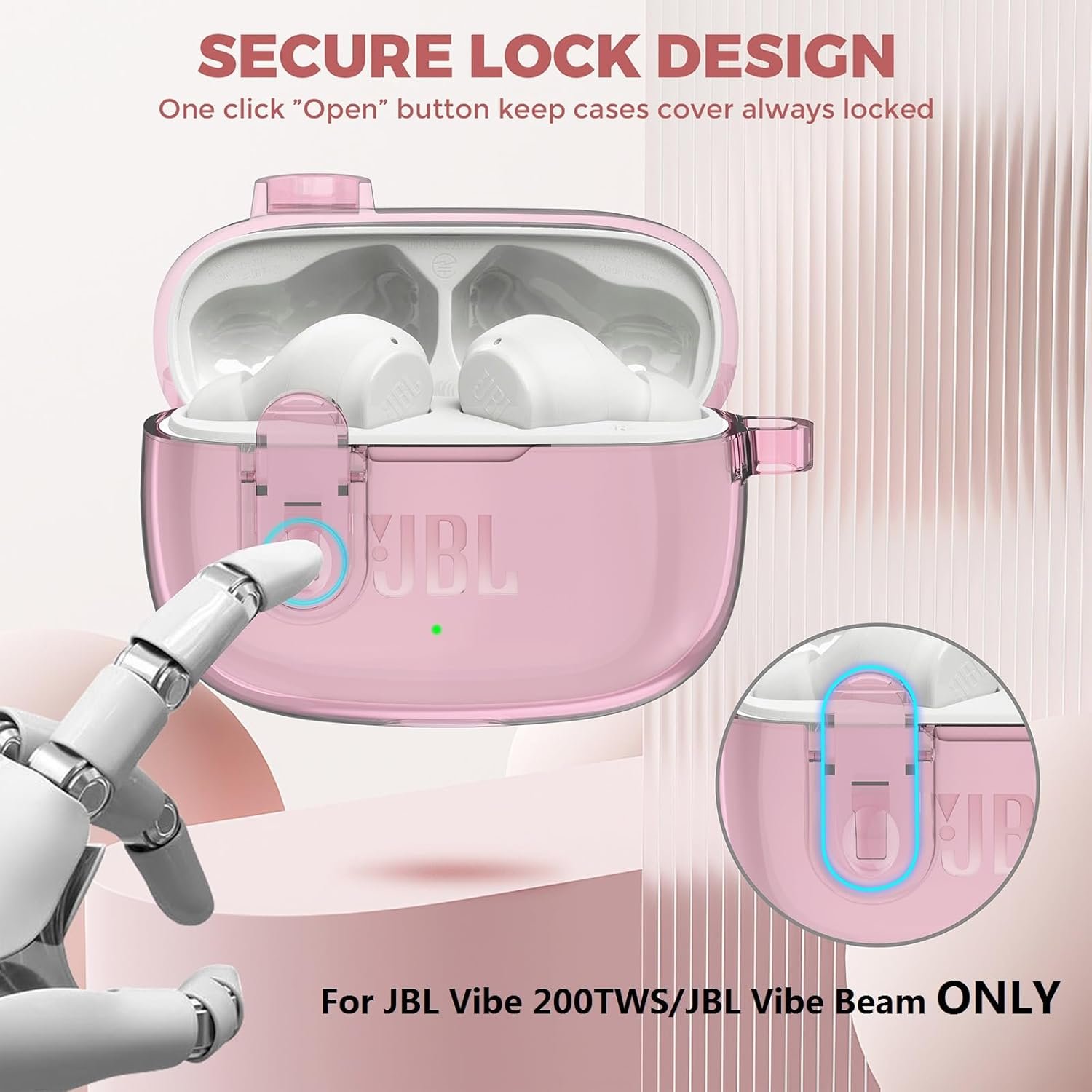 Compatible with JBL Vibe 200TWS/JBL Vibe Beam Case Cover Clear Lock Clip with Cleaner Kit, Transparent TPU Protective Case Cover Men Women with Carabiner for JBL Vibe Beam Charging Case – Pink