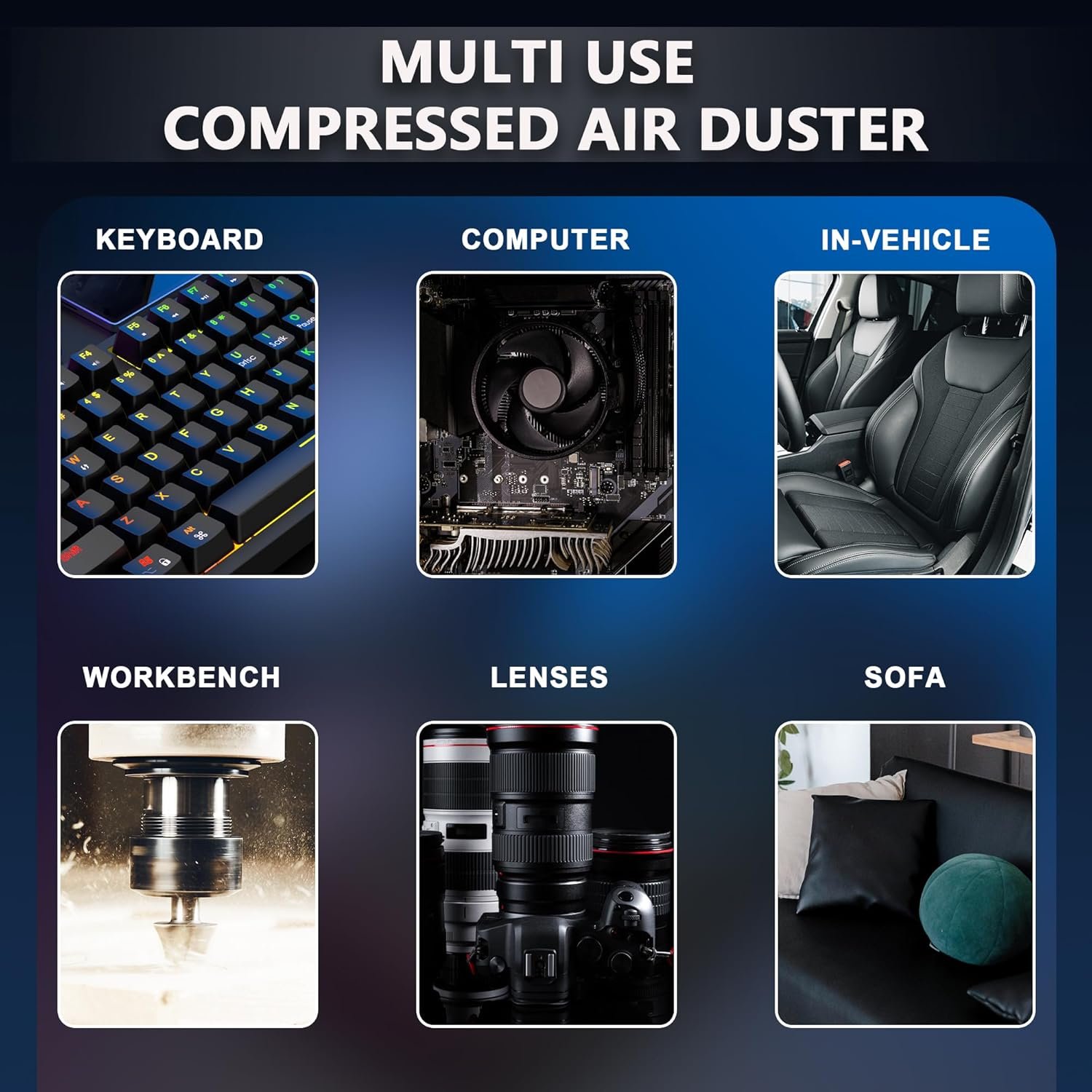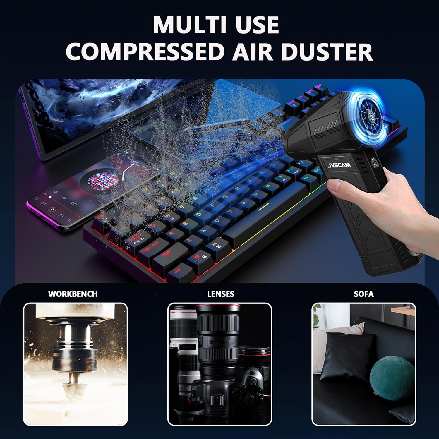 Compressed Air Duste : High speed air dust collector, strong performance, the maximum blowing force is 200g, and the peak wind speed is more than 52 m/s. It can easily remove dirt hidden in various crevices of the keyboard or any electronic device, making it extremely convenient to use in a home, office, or car dust collector.