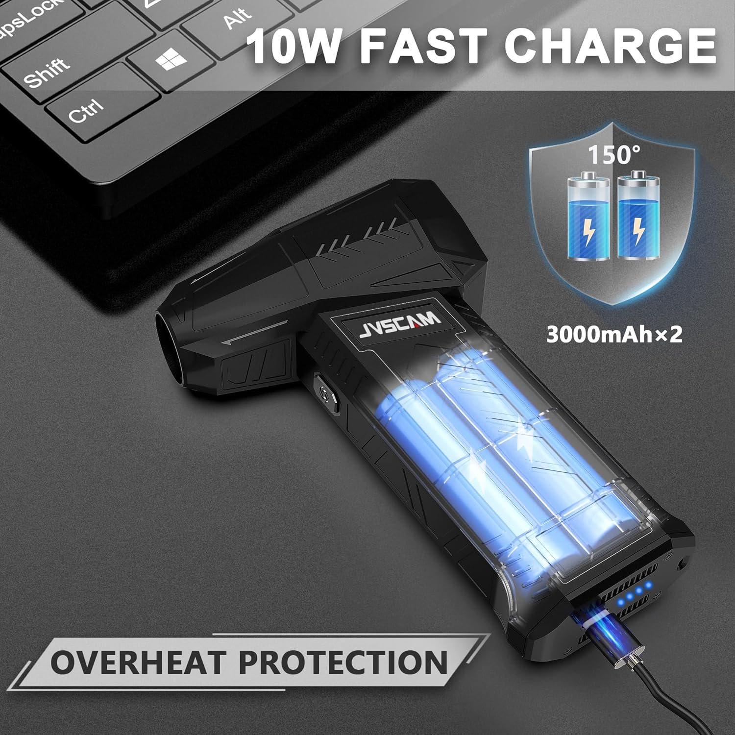 Powerful Blower with High Speed Duct Fan:3 adjustable airflow settings, allowing you to customize the airflow to meet different cleaning needs. Provides efficient cleaning. Built-in large-capacity battery (the battery is equipped with temperature protection, current protection, and short-circuit protection). And it supports 10W fast charging.