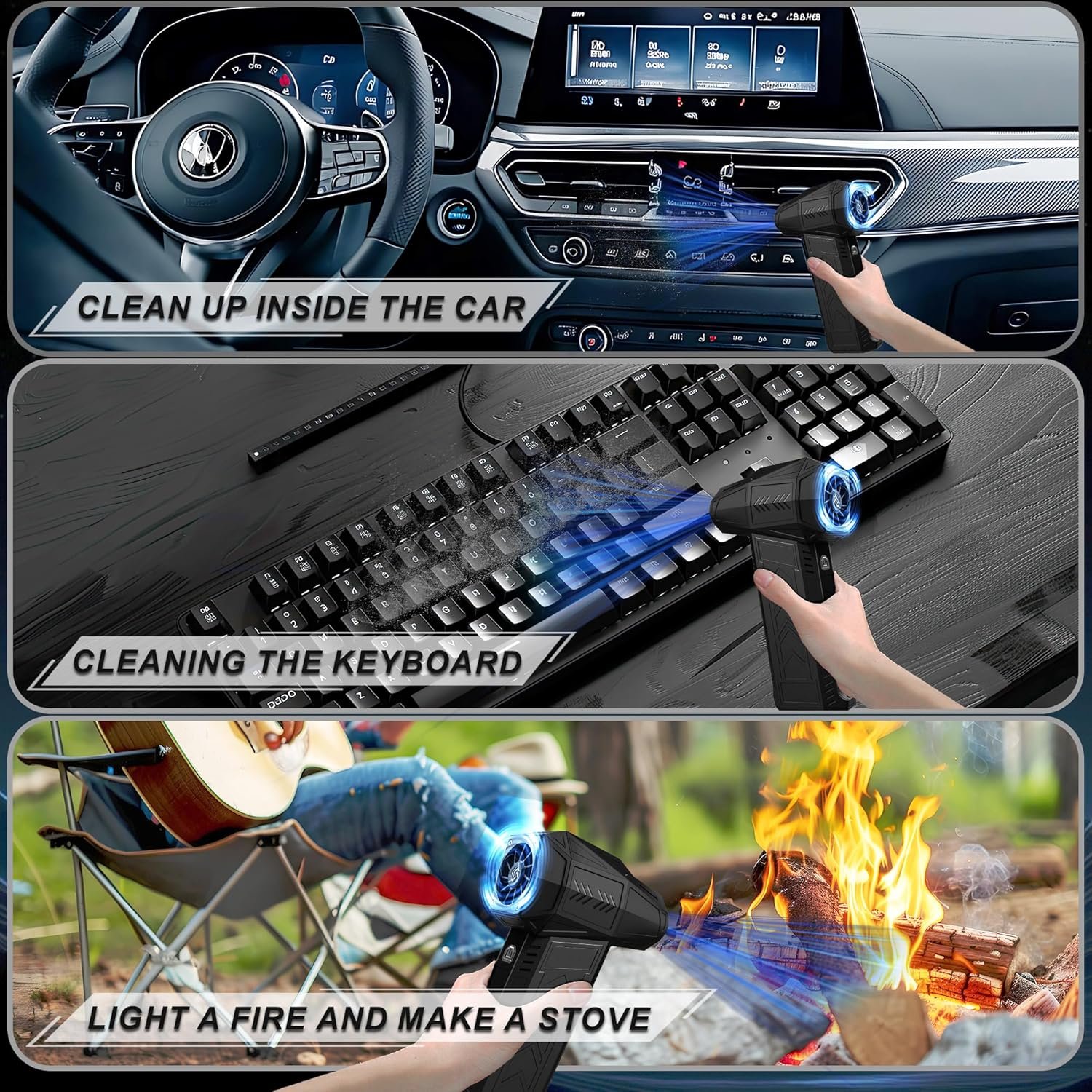 Multi-Purpose Air Blaster:Electric blowers are ideal for cleaning small, narrow and difficult places such as computer keyboards, laptops, cameras, car seats, and blinds, and can also be used to sweep snow, clean the floor, and pet hair.