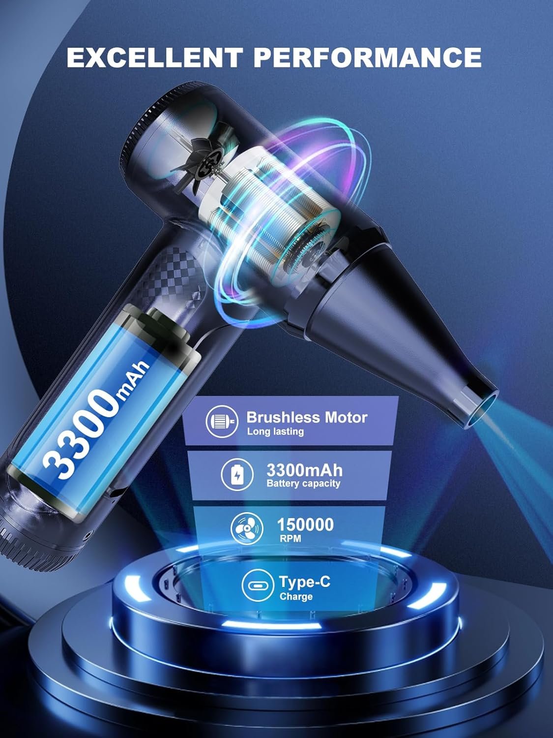 【Long Lasting Air Blower】: The air blower comes with a built-in 3300mAh battery, providing 20-40 minutes of continuous operation. It ‘s fully charged within 3 hours using the included Type-C fast charging cable. Note that an adapter is not included, but it can be charged by any USB C charger. Be aware that since the motor rotation needs to eliminate heat transfer to extend the service life of the motor, the specially designed motor heat dissipation air will blow out from the charging port. This is on purpose designed for better use this air blower