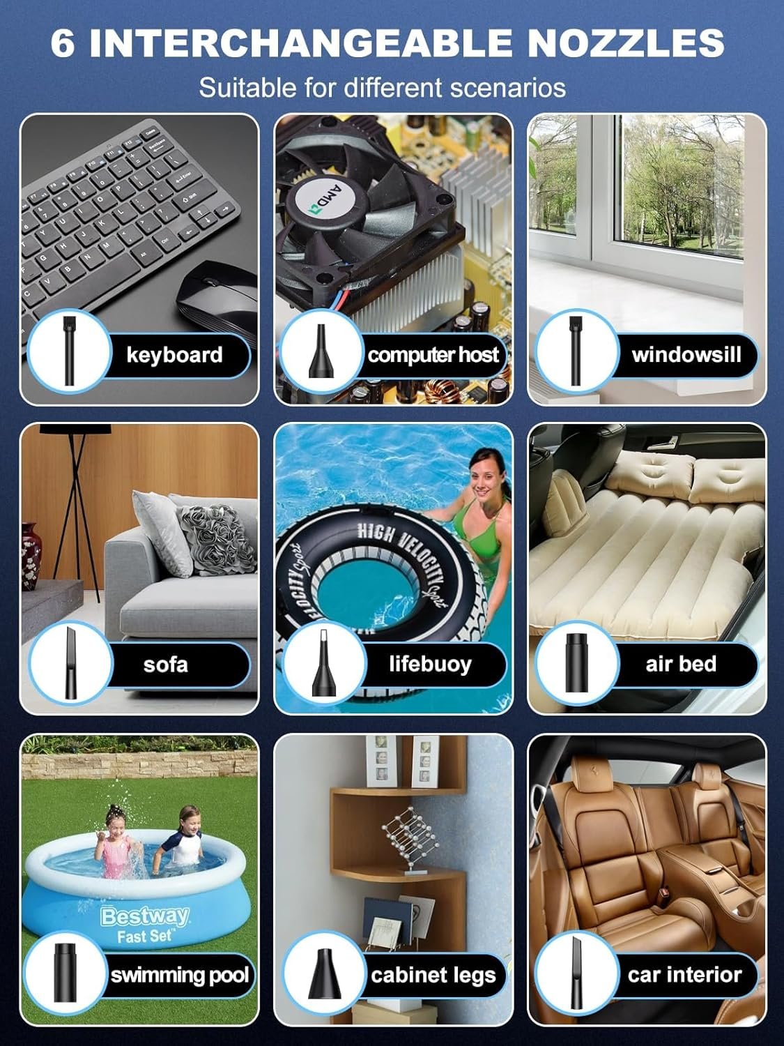 【Multi-scenario Usage Air Duster】: This air duster offers multi-scene cleaning. Equipped with 6 nozzles and 2 brushes,The slim and long nozzle effortlessly reaches corners and hard-to-reach areas. It’s suitable for keyboard cleaner, computer duster, car cleaner and more. The nozzle can also be used for inflating swimming rings, yoga balls, air mattresses, and more