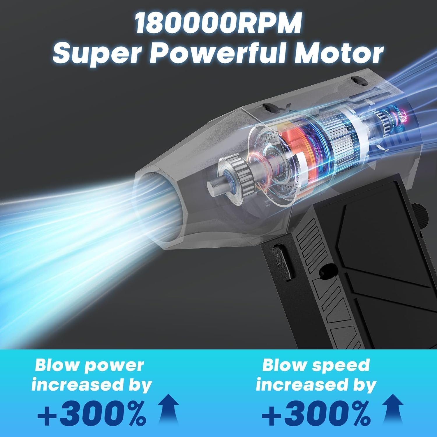 【180,000 RPM Super Powerful Turbine Motor】This compressed air duster has a maxi speed of 180,000 RPM, delivering up to 200G of air pressure and over 80 m/s of air velocity. The ultra high-speed turbine motor ensures superior performance and powerful airflow, allowing you to easily remove dirt hidden in every crevice of your keyboard or any electronic device with maximum efficiency, making it extremely convenient to use in your home, office, or car dust collector
