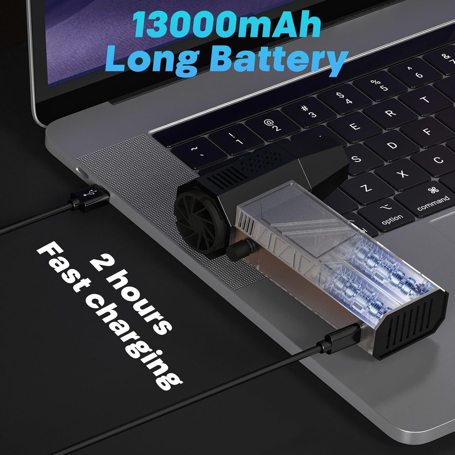 【13000mAh Long Battery Life & Fast Charging】This electric air duster is equipped with a 13000mAh battery for extended use time and ensures long-lasting performance. With Type-C fast charging, it can be fully charged in 2-2.5 hours. At the lowest speed setting, it can run for up to 60 minutes, providing reliable power for your cleaning tasks. In addition, our specially customized large-capacity battery has temperature protection, current protection and short circuit protection
