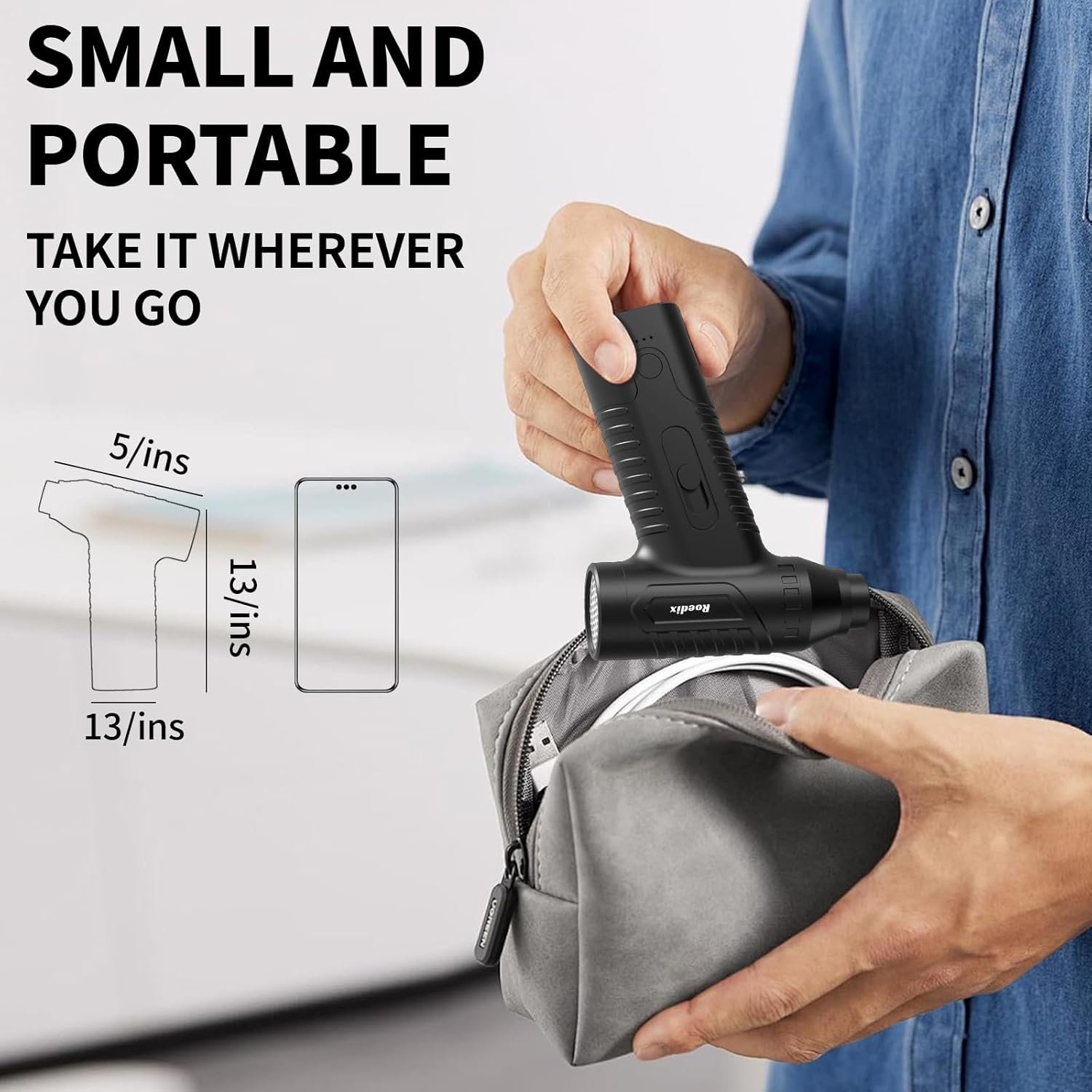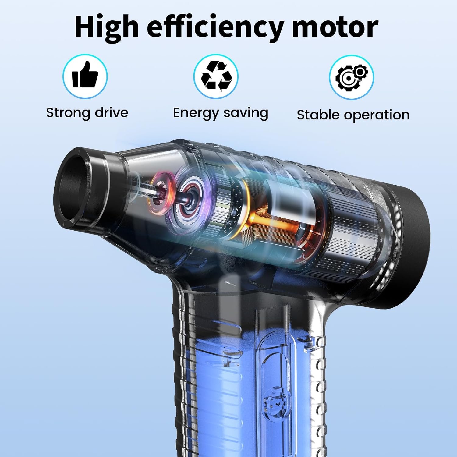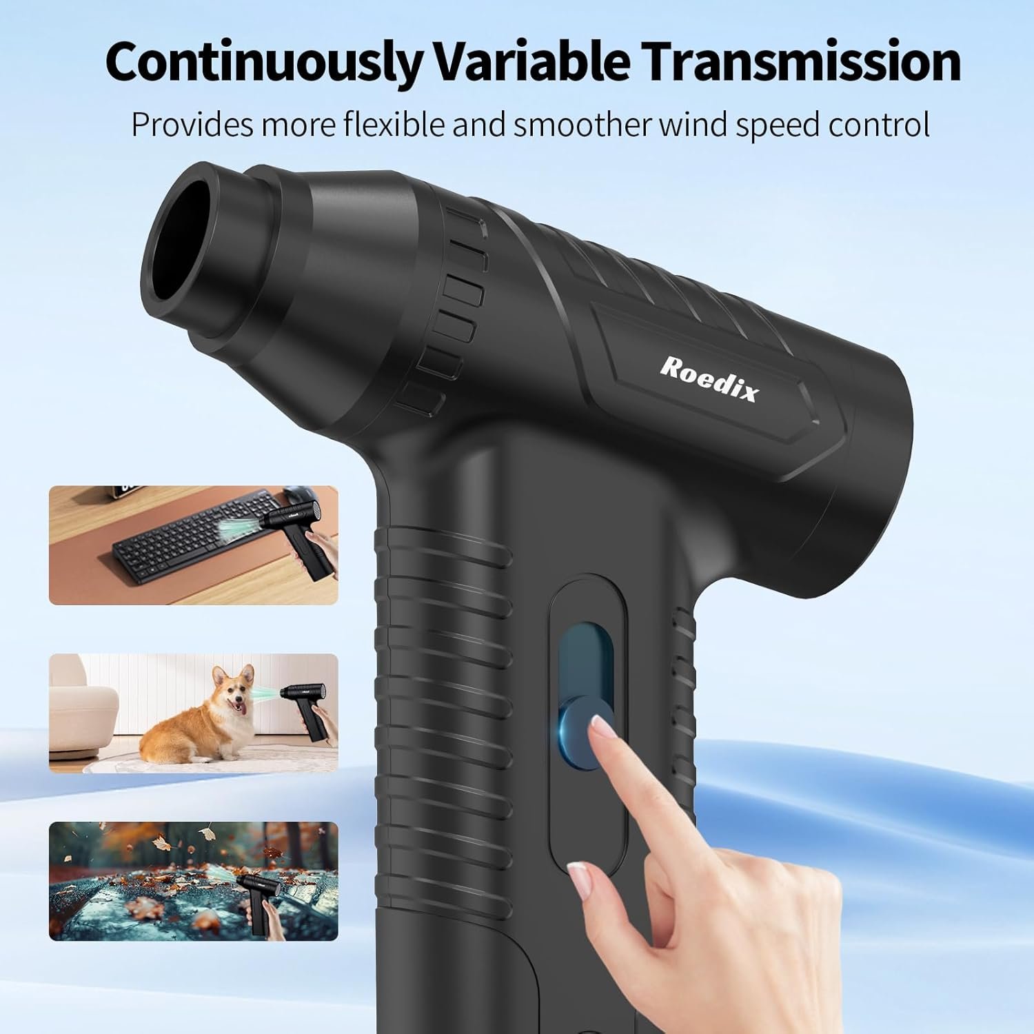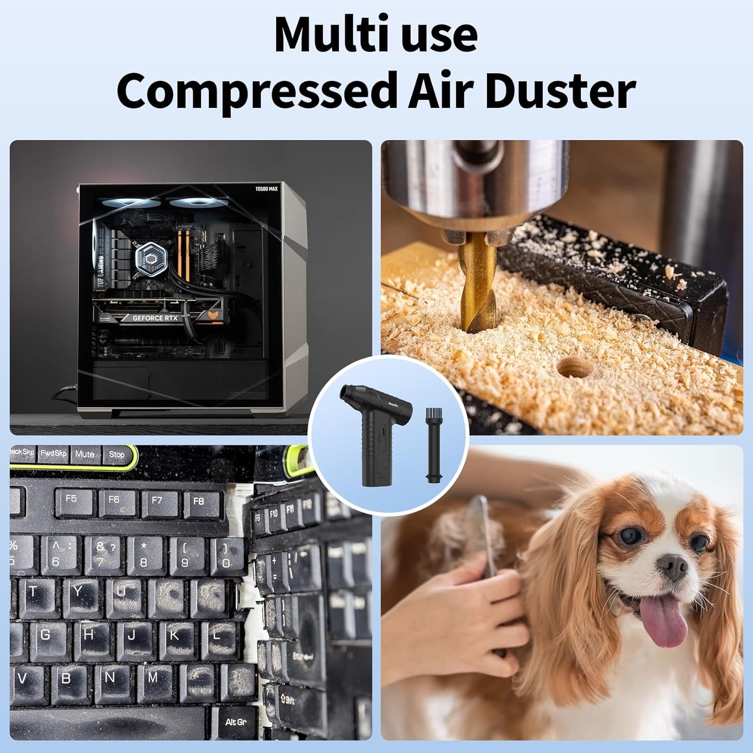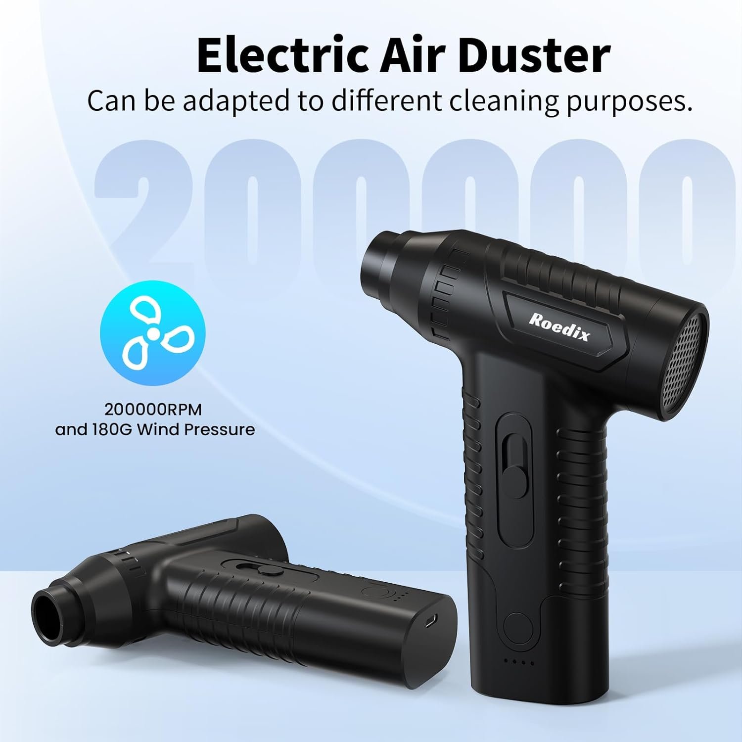 【Powerful Compressed Air Duster】 This compressed air duster features a newly upgraded brushless motor with powerful, stepless adjustable airflow, a maximum air speed of 200,000 RPM, and a maximum blowing force of 180G, which provides a strong airflow for you to clean debris and dust from all kinds of crevices