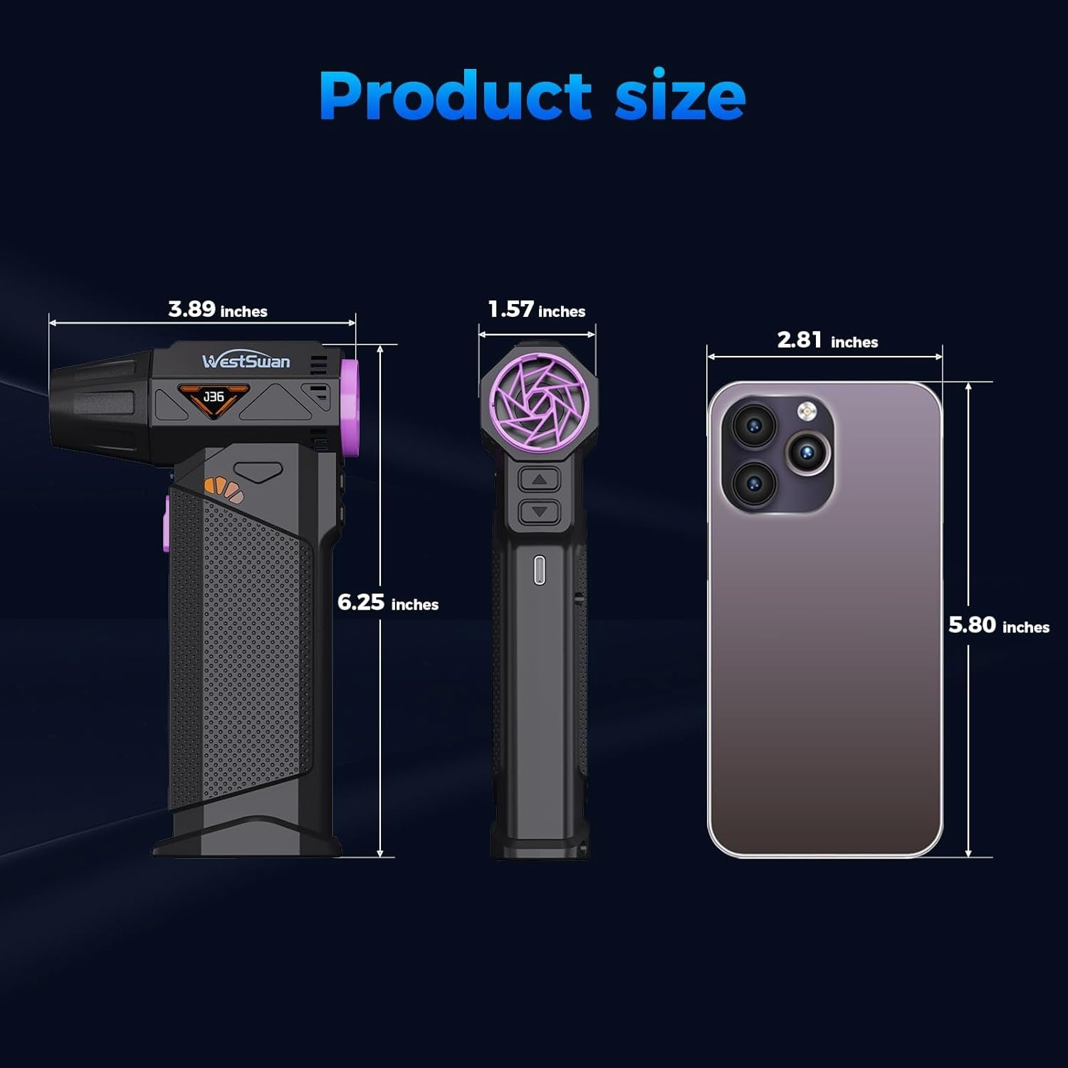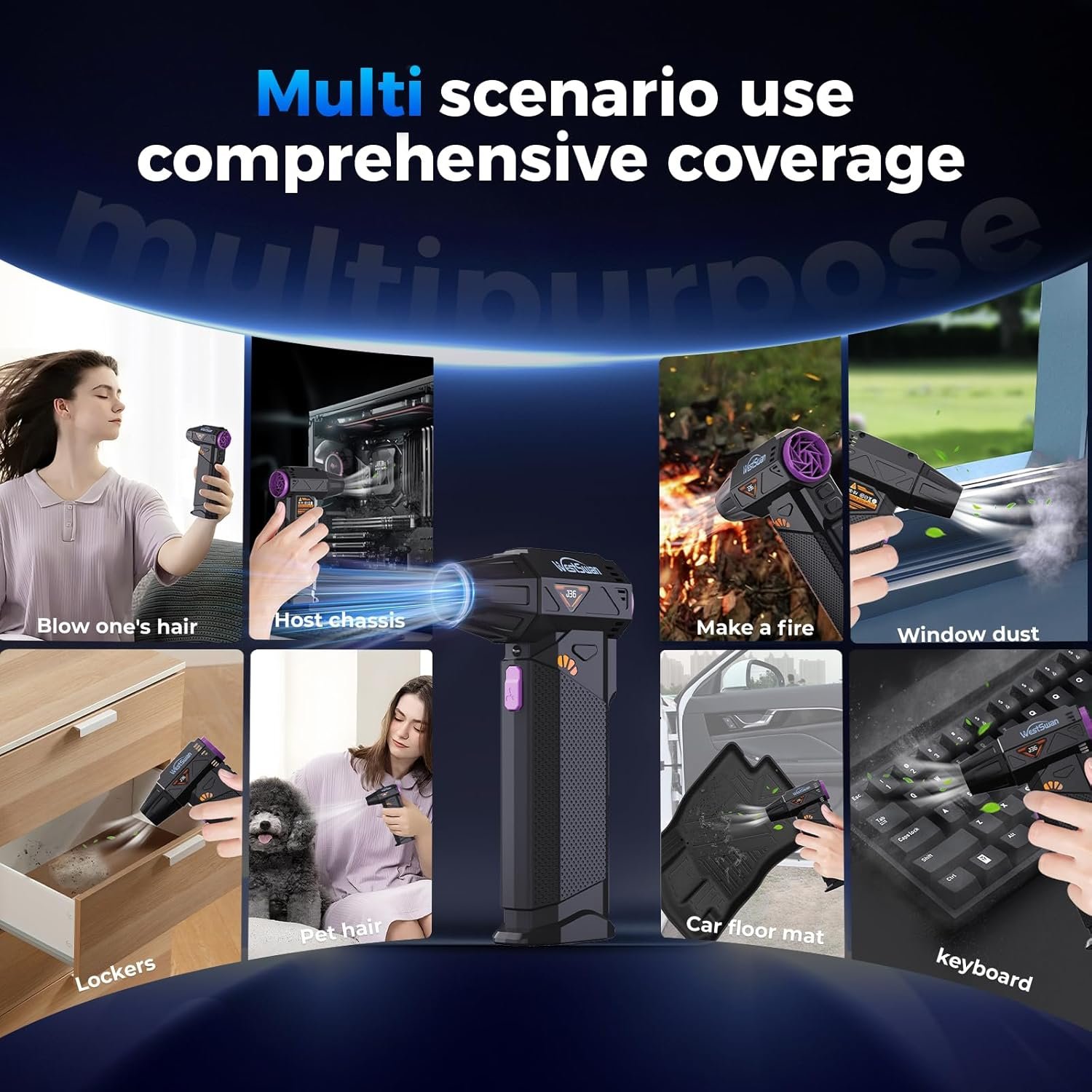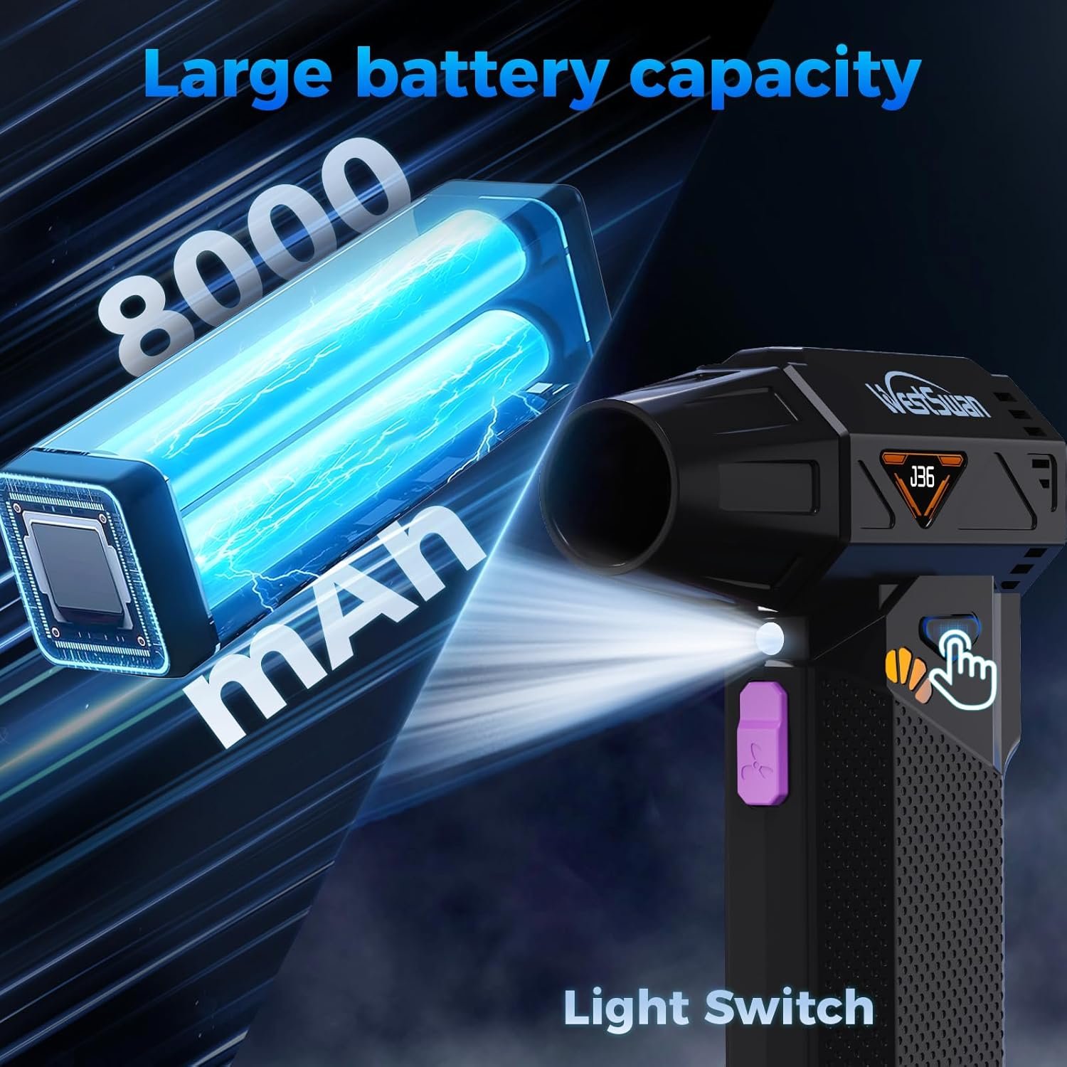 【Portable and Lighting】This air duster features a cordless design, bringing unparalleled convenience. You can take it anywhere without having to worry about the availability of a power source. Whether it’s outdoors, in a garage, or any other location, this freedom of movement is truly liberating. Moreover, this turbo blower is equipped with an LED light. In dimly lit environments, simply turn it on to provide illumination.