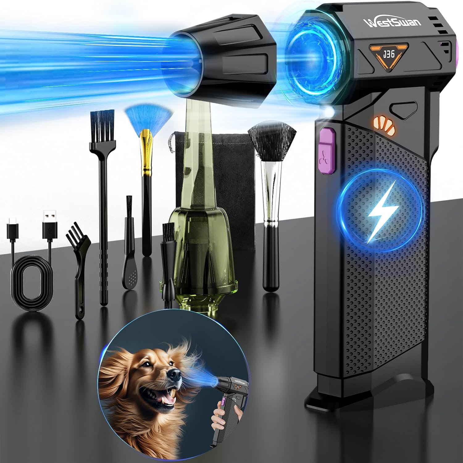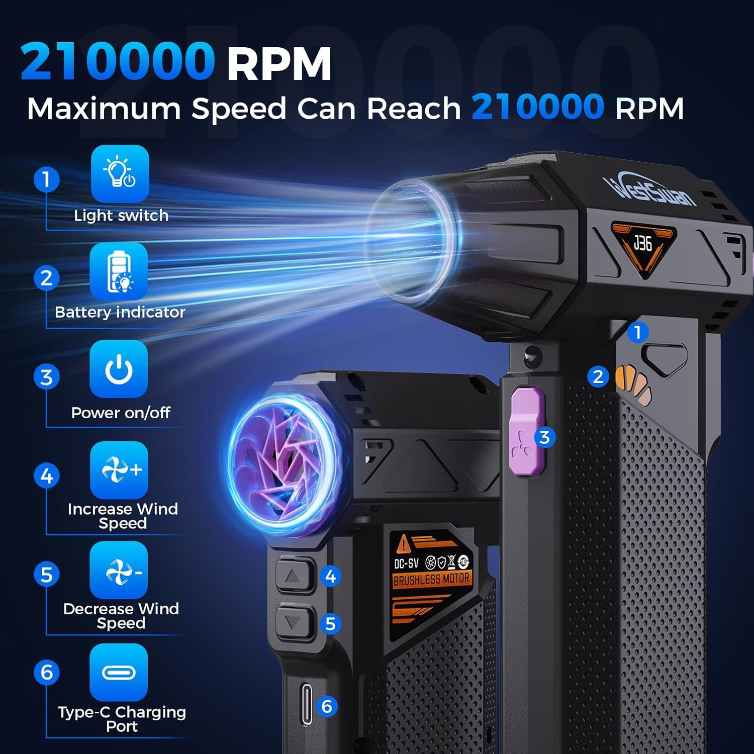 【Powerful Air Duster】 This compressed air duster features a motor with an ultra – high rotational speed of up to 210000 RPM, capable of generating an wind pressure of 320g. The powerful wind can effortlessly remove dust from various devices, it can efficiently complete the cleaning of keyboards, computers, cars, furniture, etc.