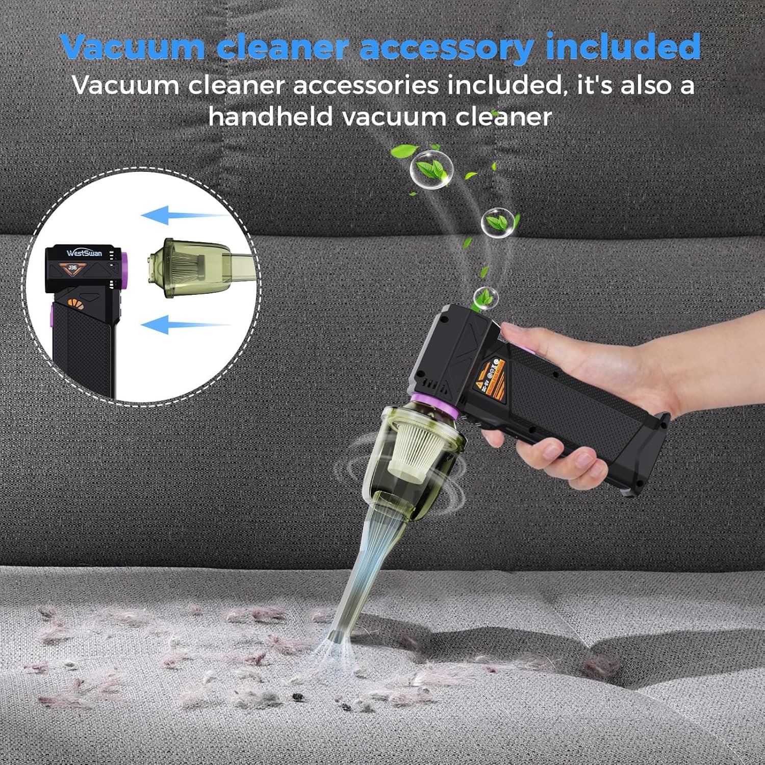 【Handheld Vacuum Cleaner】This air duster has powerful suction at the back. When you attach the vacuum accessories that come with it to its back, it instantly transforms into a handy handheld vacuum cleaner. It is highly effective in sucking up dust from window crevices, car seats, sofas as well as keyboards.