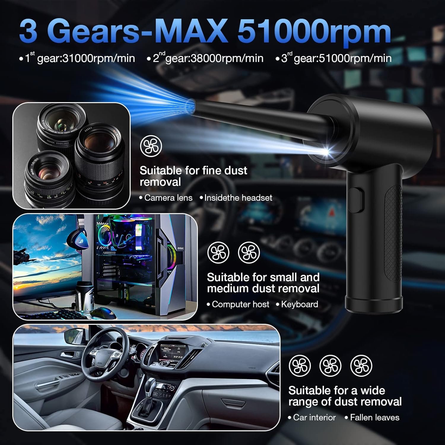 3-Speed Adjustable Power: Compressed air dusters are equipped with 3 gears of air speed, 31000-51000RPM speed selection, generating incredible airflow, Perfect replacement for compressed air cans. Great one for family, friends, workman, mechanic.