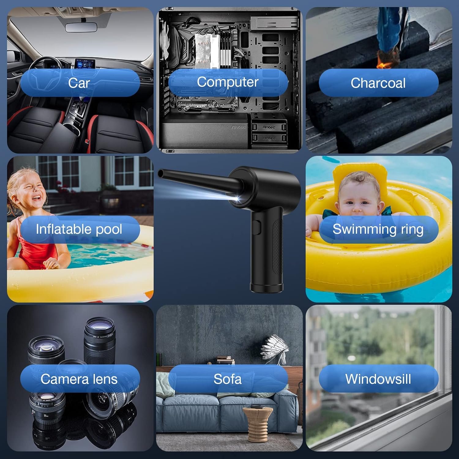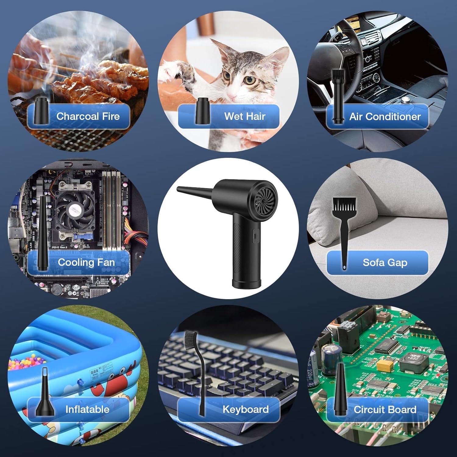 5 nozzles+2 brushes: The electric air duster come with 5 nozzles and 2 brushes; Suitable for dust removal of computer cases, keyboards, cars, fans, lily windows, etc.Use the brushs for better cleaning. The multifunctional nozzle is used to inflate swimming rings, yoga balls, air mattresses, etc.