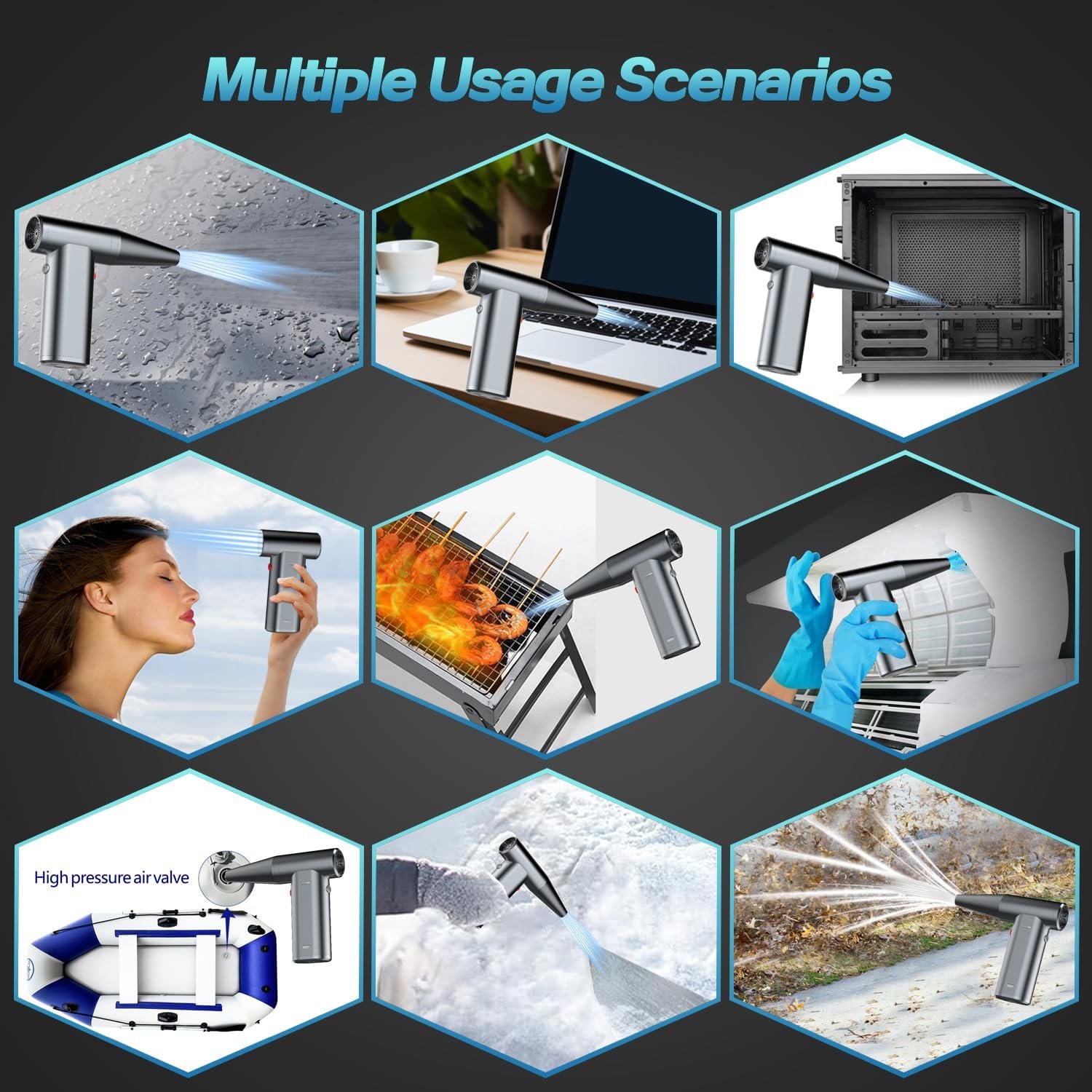 【Versatile Usage】This air blower comes equipped with three nozzles and a brush,making it suitable for dusting computers and keyboards,blowing up fires and blowing leaves outdoors,dry human and pet hair,removing dust from car interiors,clearing snow covering cars,blowing rainwater off car rearview mirrors,inflating air mattresses,blowing up balloons,serving as a fan for cooling down,and more.