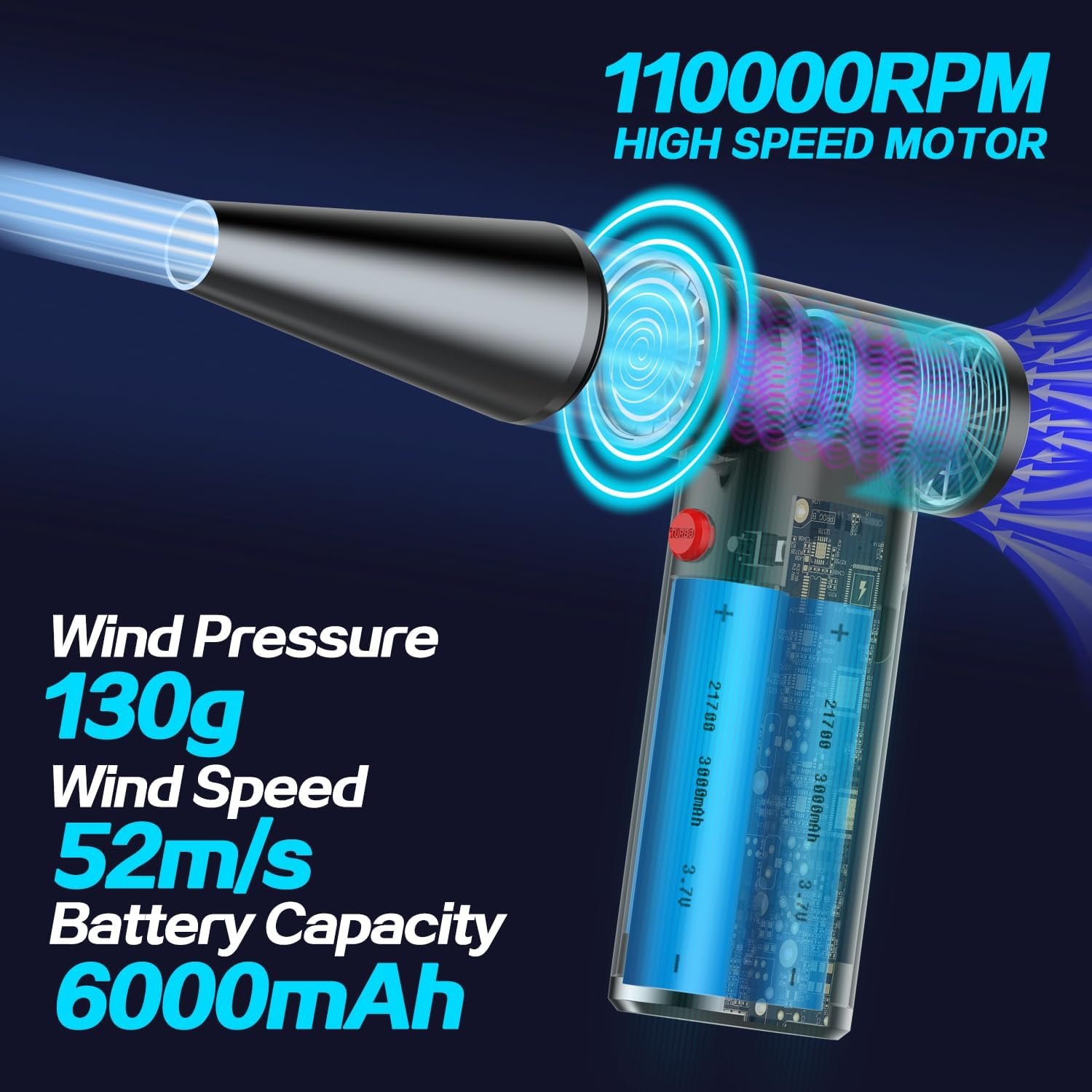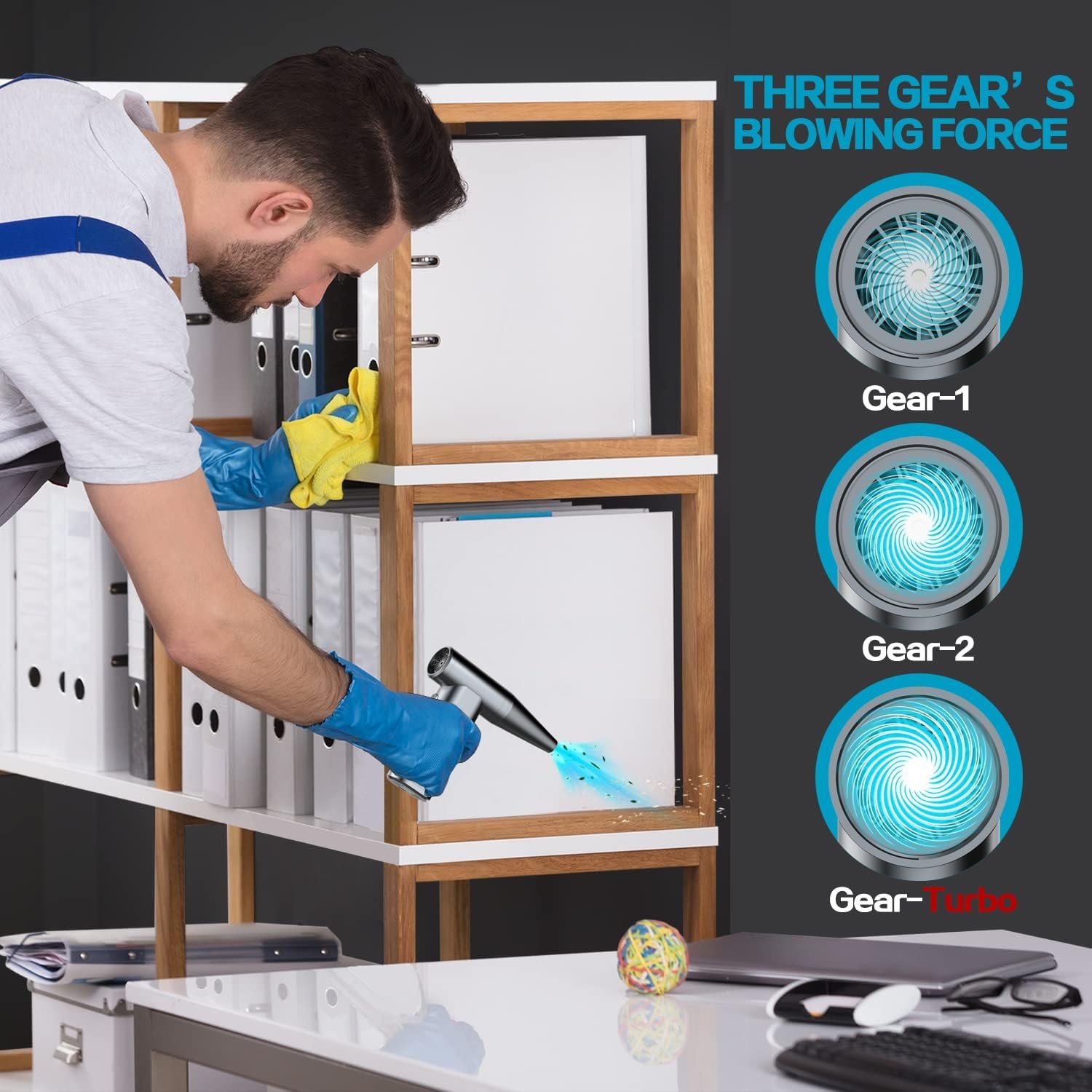 【High-Speed Motor】This air duster is powered by powerful motors, with a maximum speed of 180000RPM. With 3 adjustable model, it provides effective cleaning tailored to different tasks, maintaining optimal performance