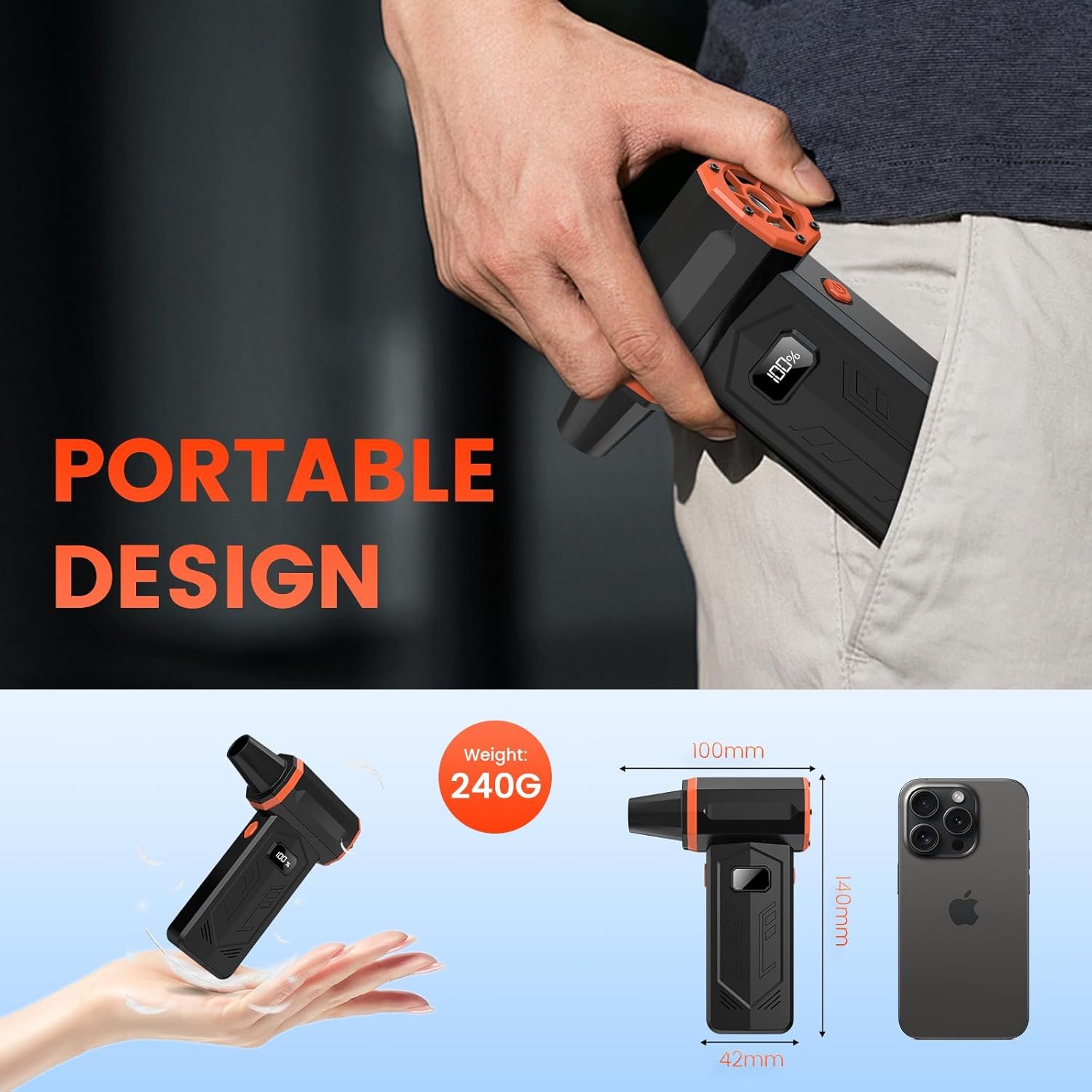 【Portable & Versatile】 Mini air blower weighing 240g. The electric air duster is lightweight and easy to carry. Jet mini blower is ideal for cleaning desktops and keyboards, drying pet hair, home clean, car clean,snow blowers etc.Turbo fans also useful for outdoor activities ,such as picnics and fire-starting.
