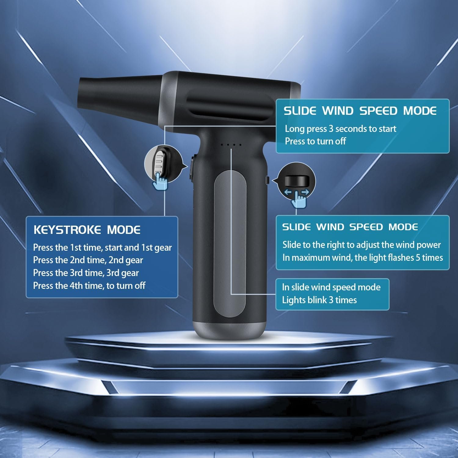Compressed air duster【New sliding mode Functional Design】–In traditional air dusters, it’s all 3-gear mode.This air blower has been upgraded, with【 button mode】 and 【sliding mode】, you can choose freely. Jet Fan 【sliding mode】 smooth sliding, more convenient and sensitive to use, you are free to choose the wind power you need. Jet fan dry blower Pc dusters for cleaning, so easier !