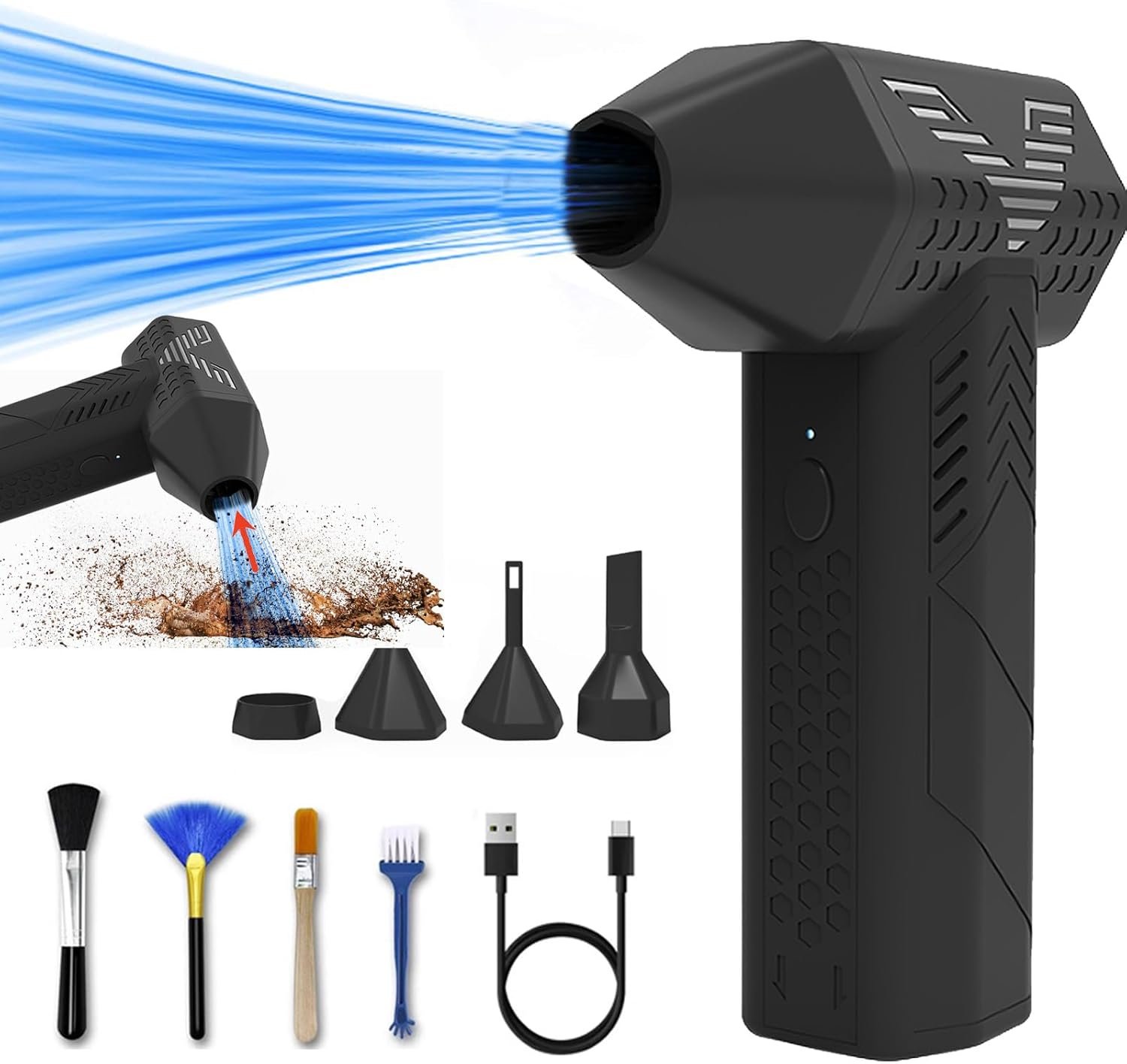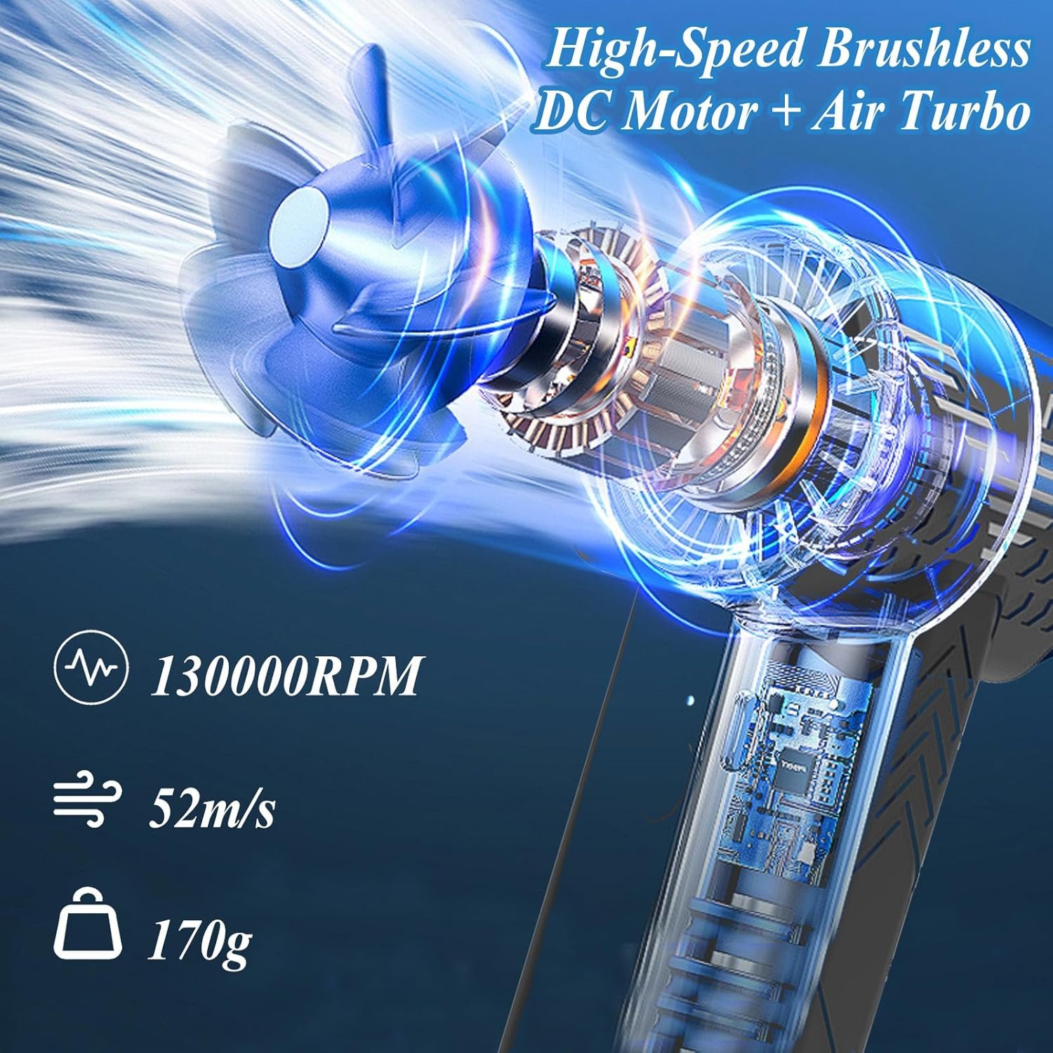 【130000RPM Brushless Motor】The air duster is equipped with a high-speed brushless DC motor with a speed of up to 130,000 RPM, an air velocity of up to 52 m/s and a maximum blowing weight of 170 g. The brushless motor is coupled with turbocharging technology to increase the airflow. Remove accumulated dust and dirt easily.