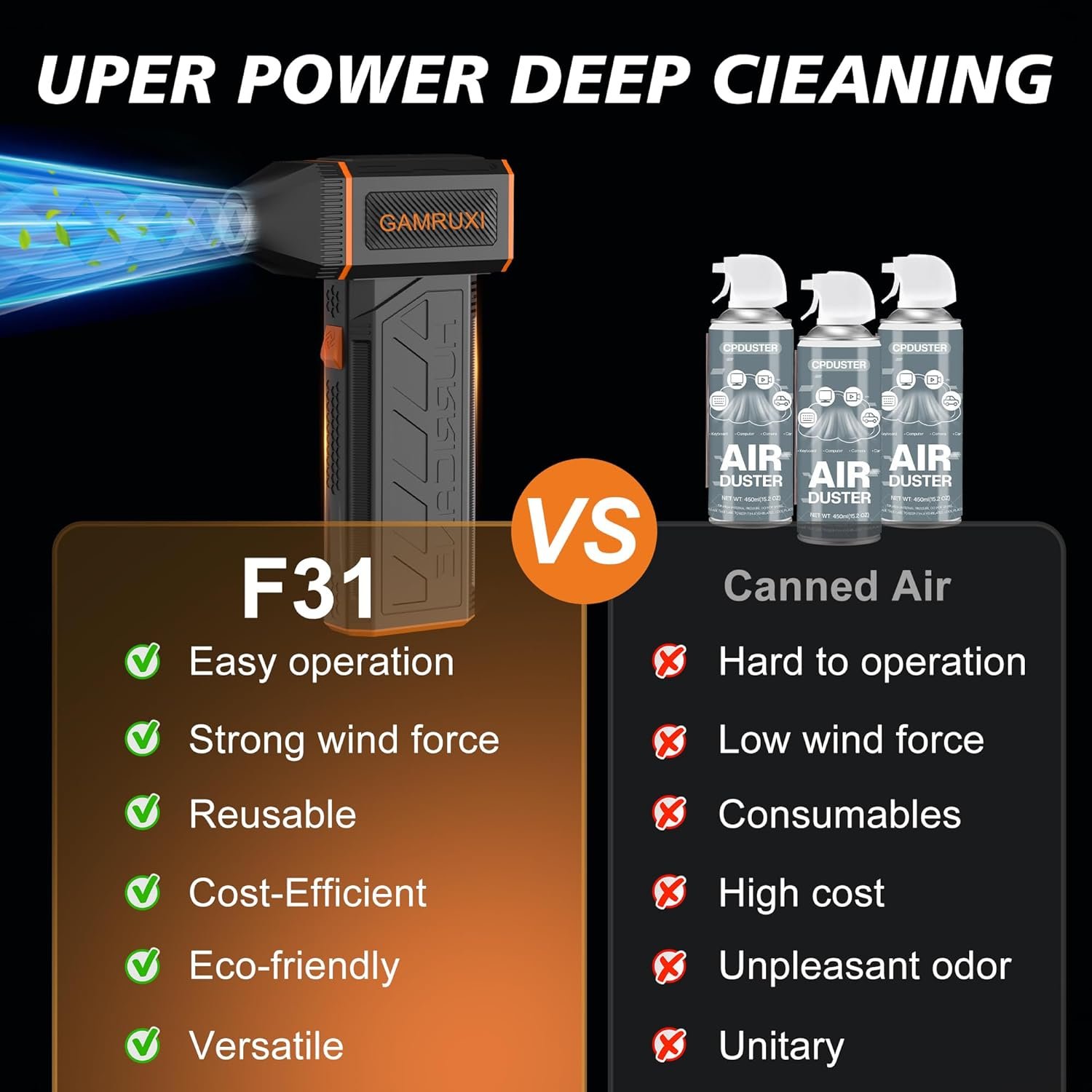 【Cordless & Portable Air Blower 】Unlike canned air duster tanks. Our mini air duster is rechargeable and use. Additionally, there is no risk of liquid or ice forming during the cleaning process, which helps safeguard your keyboard PC and home appliances from potential damage.
