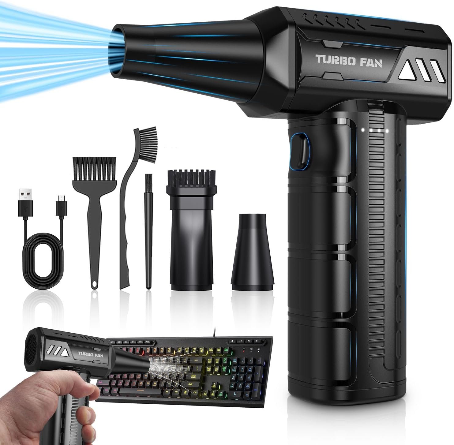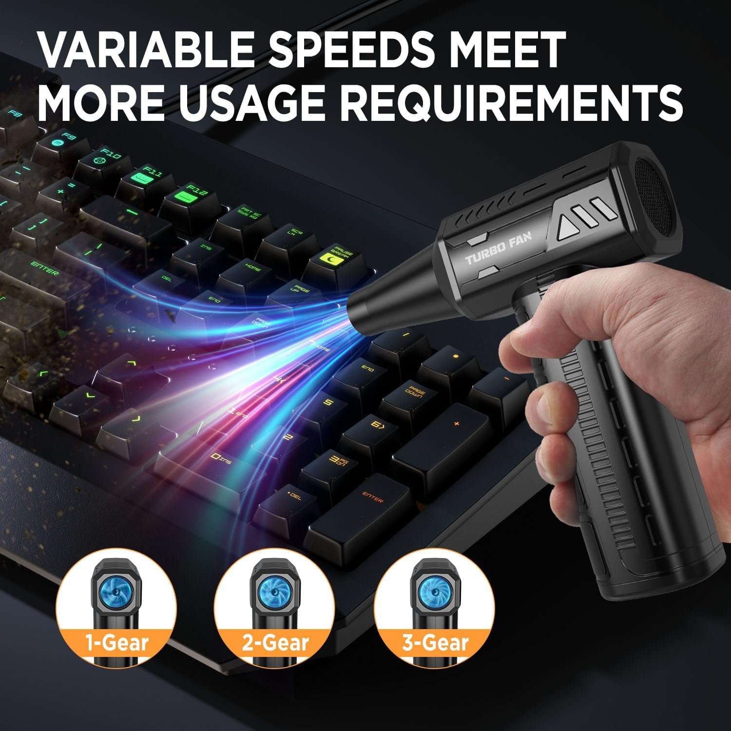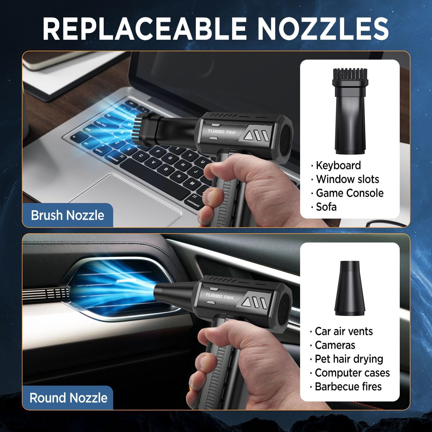【Upgraded High-Capacity Battery & Fast Charging】 The rechargeable air dusters have built-in 10000mAh batteries, which provide enough power for long hours of use. These batteries are temperature, current, and short-circuit protected, so the fan air speed will not decrease even after prolonged use. At the same time, they support fast charging and have a Type-C connector, making them compatible with a variety of charging methods, including charging from a car or mobile power source.