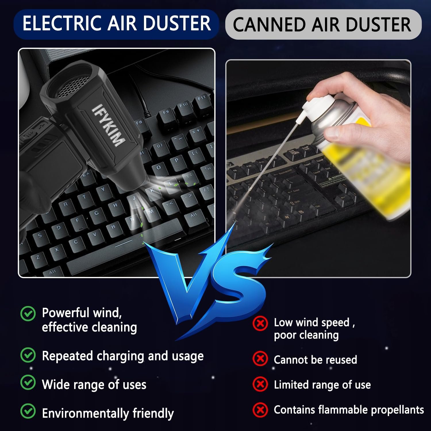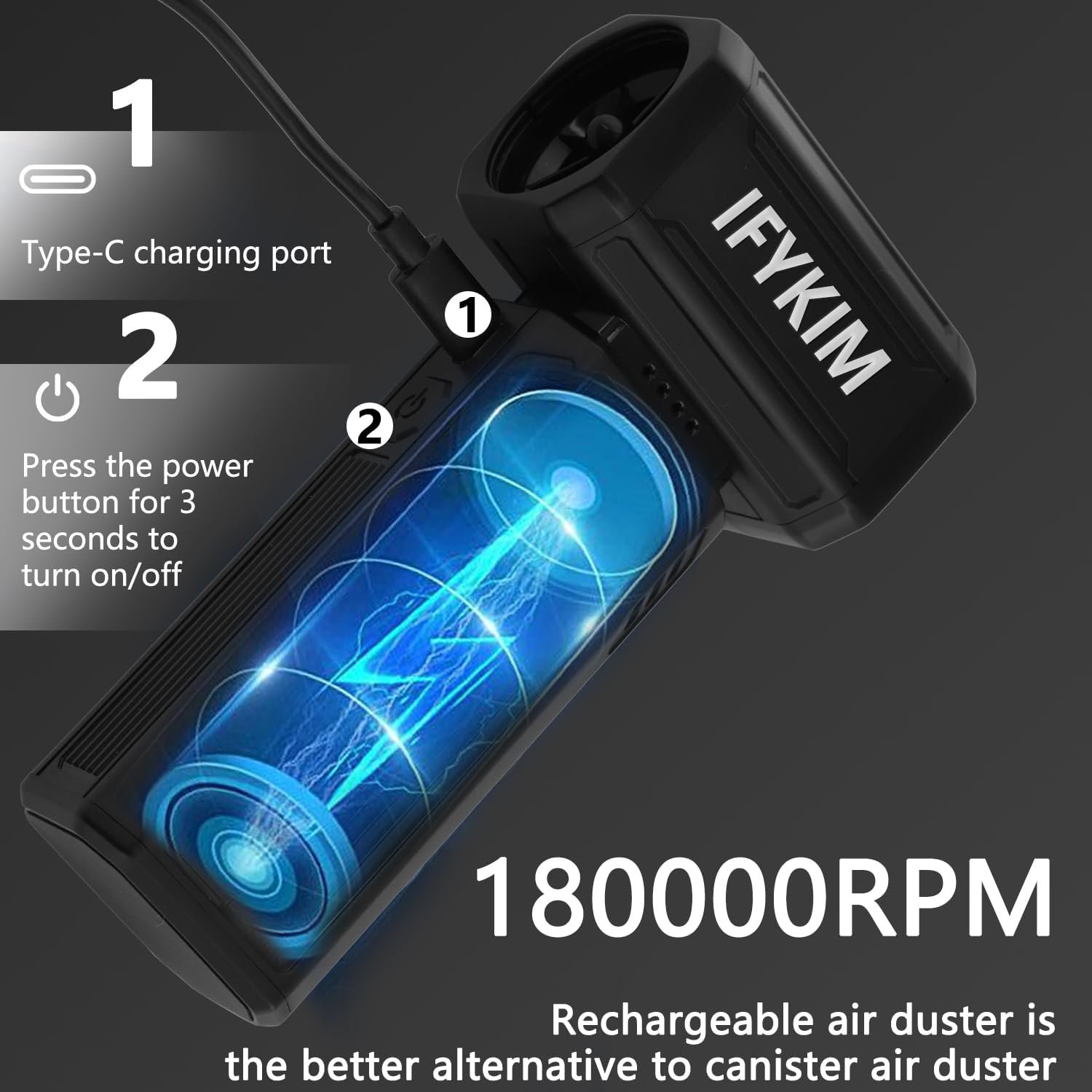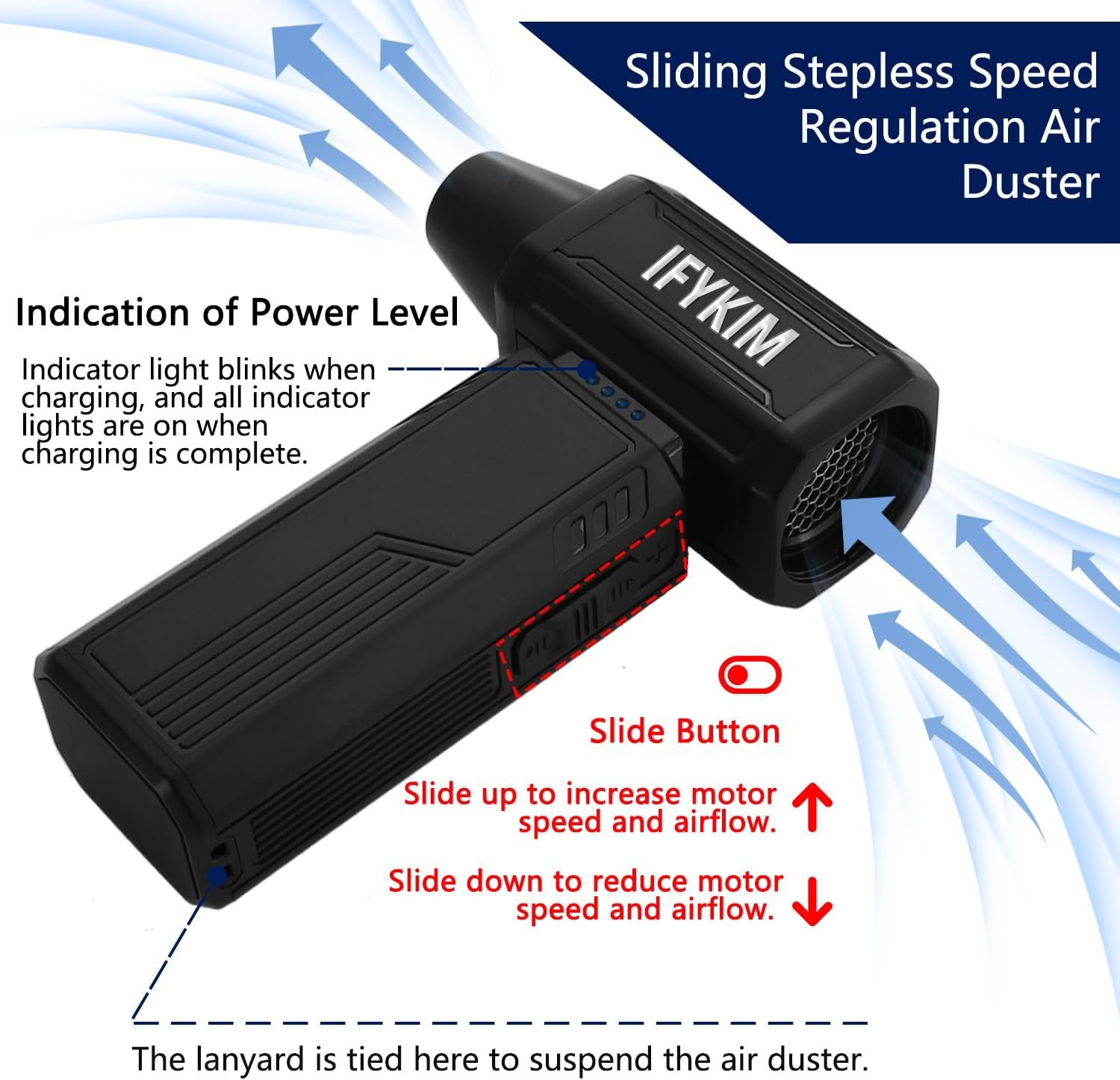 POWERFUL AIRFLOW: Our compressed air duster is a new upgraded version with a sliding infinitely variable speed setting. Push the button to slide up to increase the speed and airflow up to 180,000RPM; slide down to decrease the speed and airflow. When in use, you only need to press the power button for 3 seconds to turn on/off, which is very simple and quick to operate