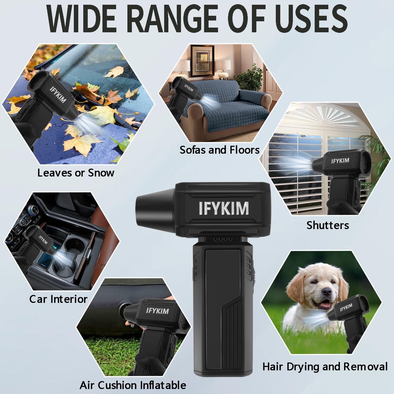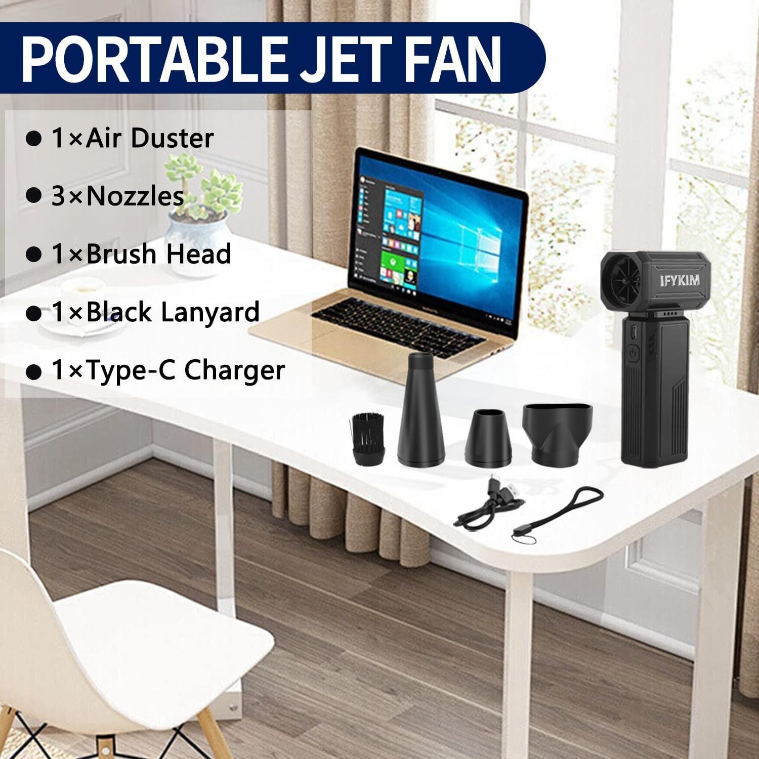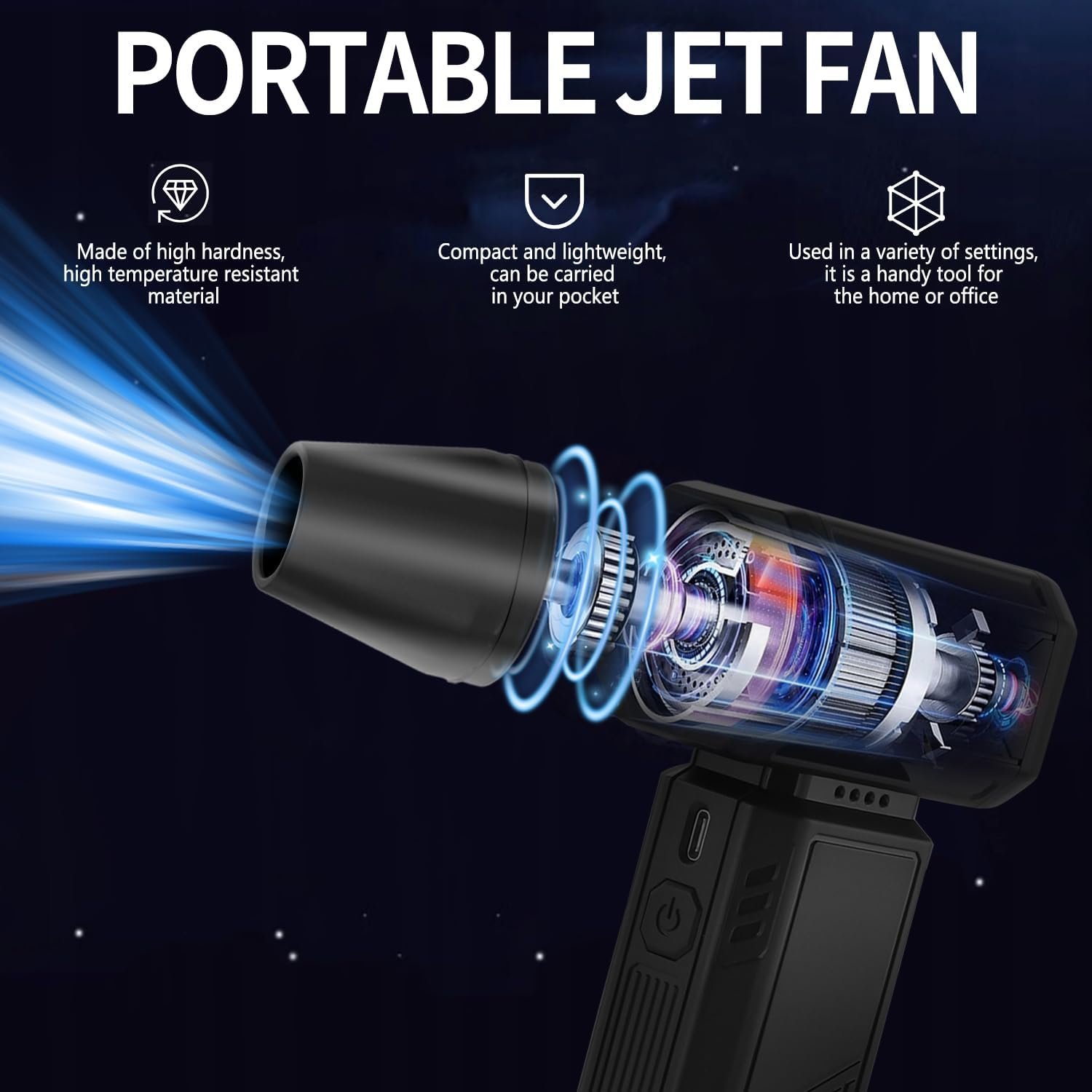 Portable jet fan is not only suitable for computer keyboards, but also for cars, blinds, air mattresses, cameras, cleaning floors, removing hair; for drying floors, blow-drying nail polish, cleaning tight places and more.Its versatility can be called a handy tool for home or office.
