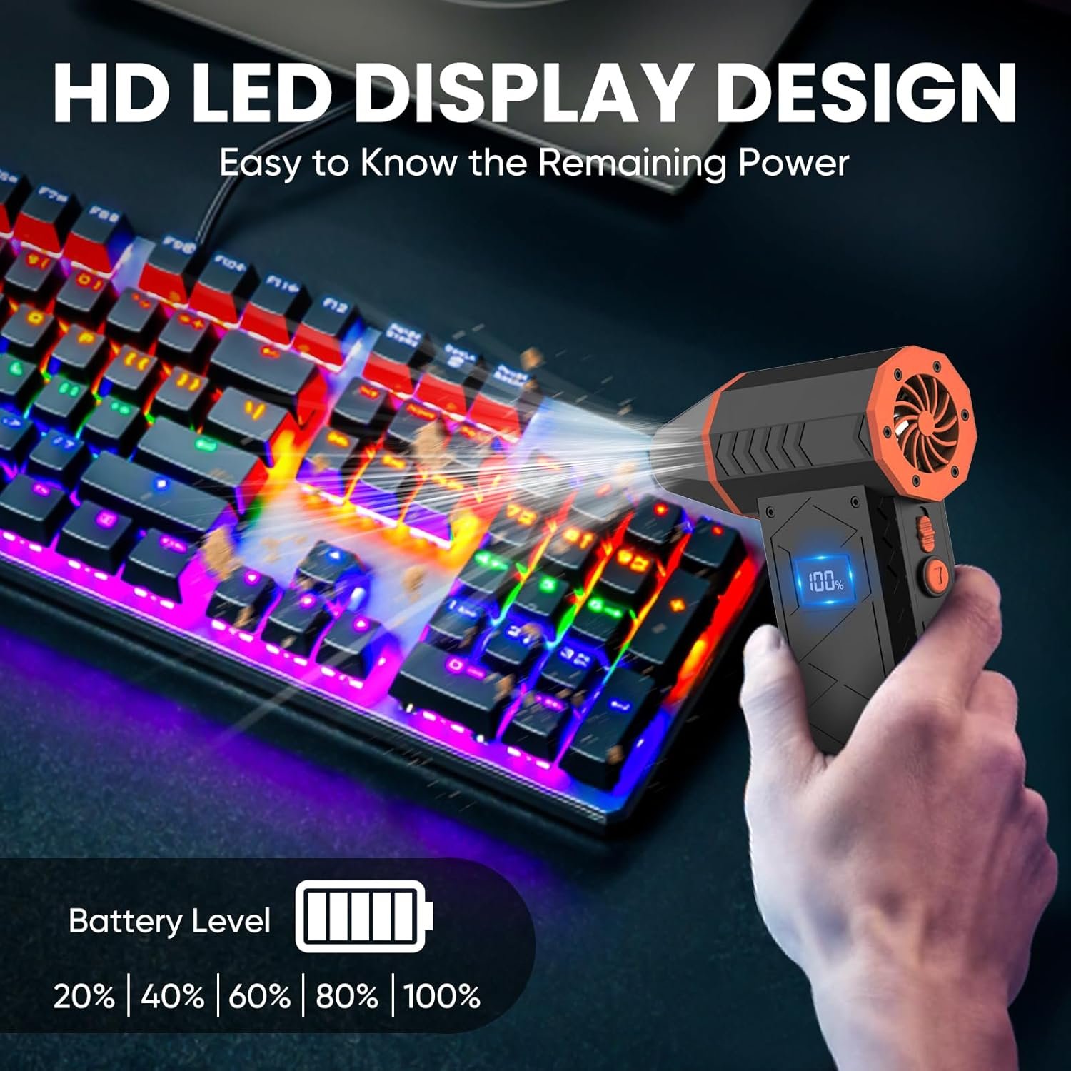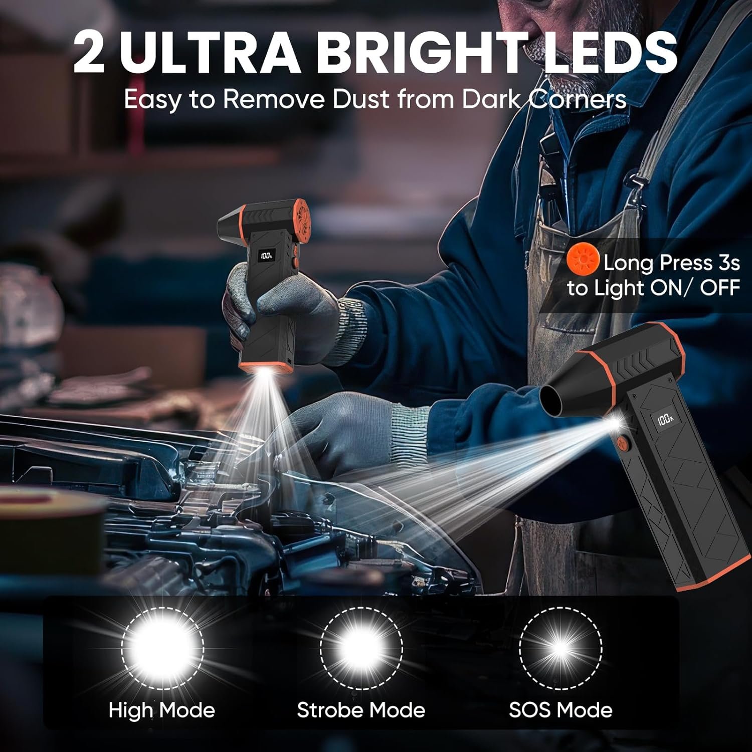 Flashlight & Led Display: The upgraded air duster electric doubles as a flashlight with 3 lighting modes: direct, flash, and SOS, making it perfect for outdoor use. The built-in auxiliary light focuses while cleaning, making cleaning easier. In addition, the upgraded LED display shows the remaining power.