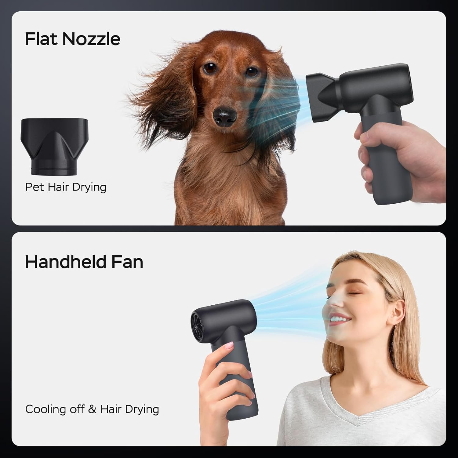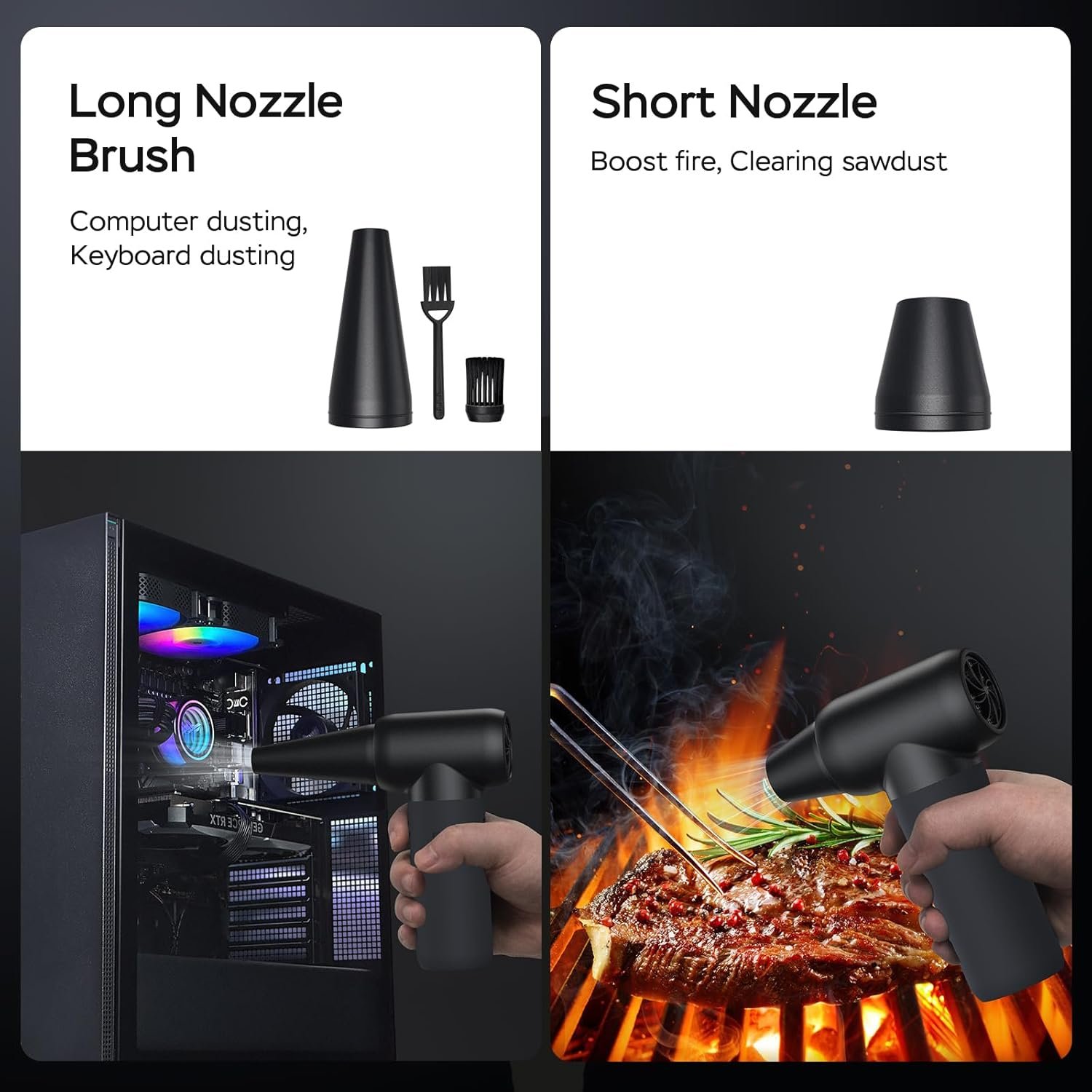【Versatile Uses】This compressed air duster is equipped with 3 nozzles and 2 types of brushes. It’s superior for cleaning computers, keyboards, air conditioners, blinds, and outdoor jobs such as clearing leaves from cars, blowing water off side mirrors, and removing interior dust. It can even be used to boost the fire for your BBQs, act as a dryer for humans and pets, function as an inflator for mattresses and balloons, and serve as a cooling fan during hot weather.