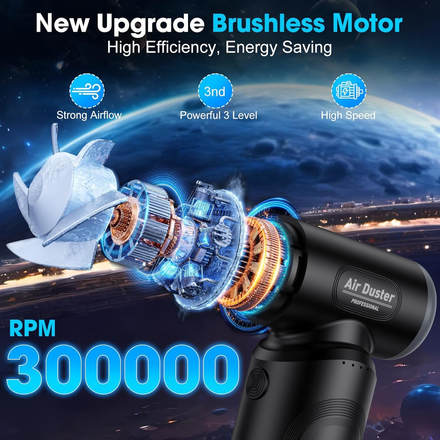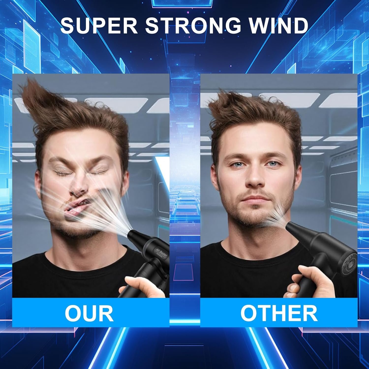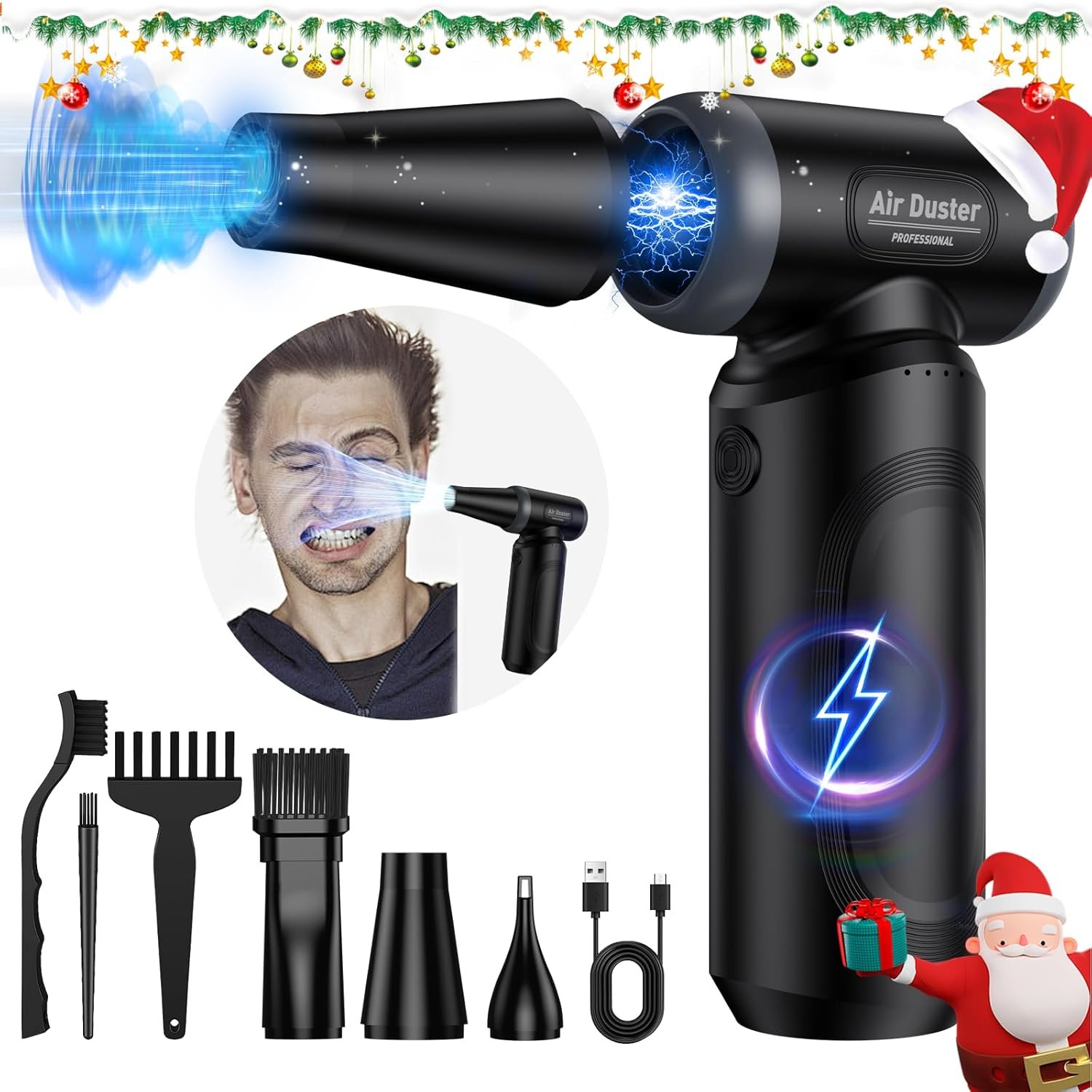 Electric Compressed Air Duster: This cordless air duster uses new powerful high-speed motor technology with a high speed of 300,000RPM and a blowing force of 225G. Compressed air can give high performance. strong wind might cause distortion of the face. New upgraded, easy to clean every area,crevice