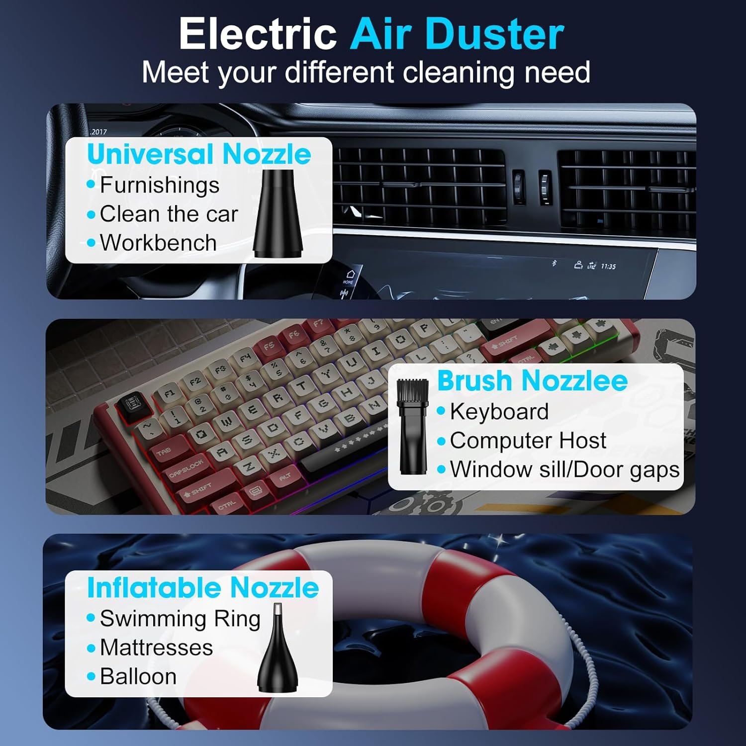 Multi-purpose: Mini air blower easy to carry, fits in pocket.It is ideal for keyboard cleaning kit, pc duster, cameras,laptops,car seats,and window.electric leaf blower,snow blower, As well as for fires, ground cleaning, picnics, and pet hair removal