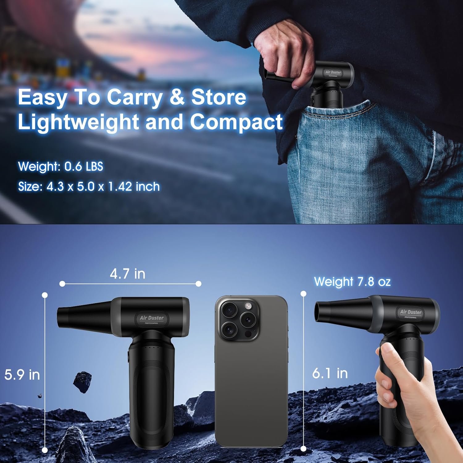 High Quality & Material: The computer duster is made of high-hardness and high-temperature-resistant ABS, PP materials, with a perfect texture, strong power, and minimal heat generation. Size:5.9×4.7×1.7in, Weighing only 0.39 pounds, this jet dry blower is lightweight, easy to carry, and comfortable to grip