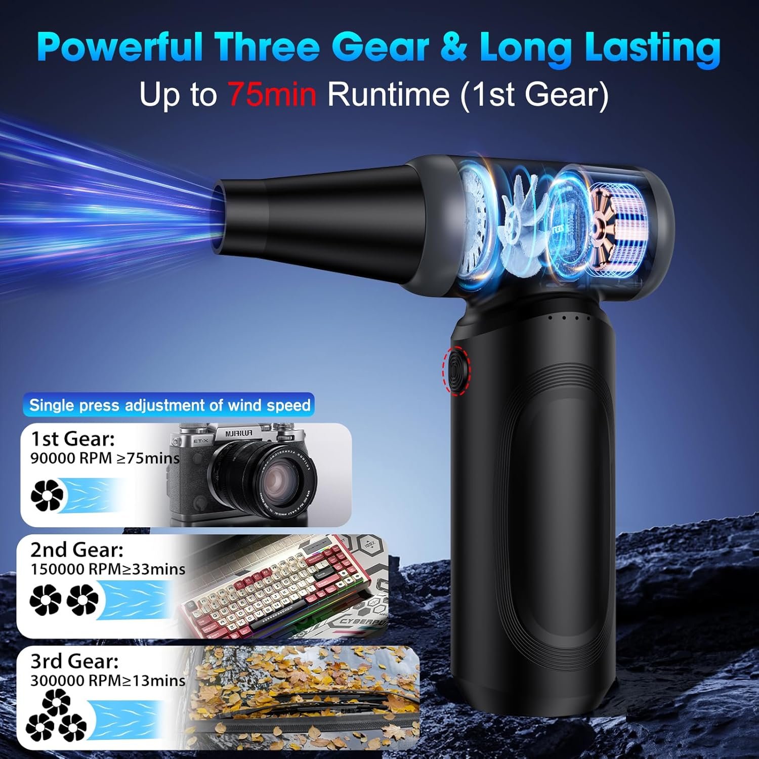 Rechargeable Air Duster with Type-C Charging: Electric Air Duster is a USB Type-C charging cable that provides 5V/2A fast charging. After being fully charged in 2-2.5 hours, the electric air duster can be operated for up to 75 minutes at 1 wind speed. Under high-intensity 3rd level blowing force, it can be used continuously for 13 minutes. Adopting power intelligent technology to maintain wind speed stability. The indicator light also allows you to see how much electricity is left