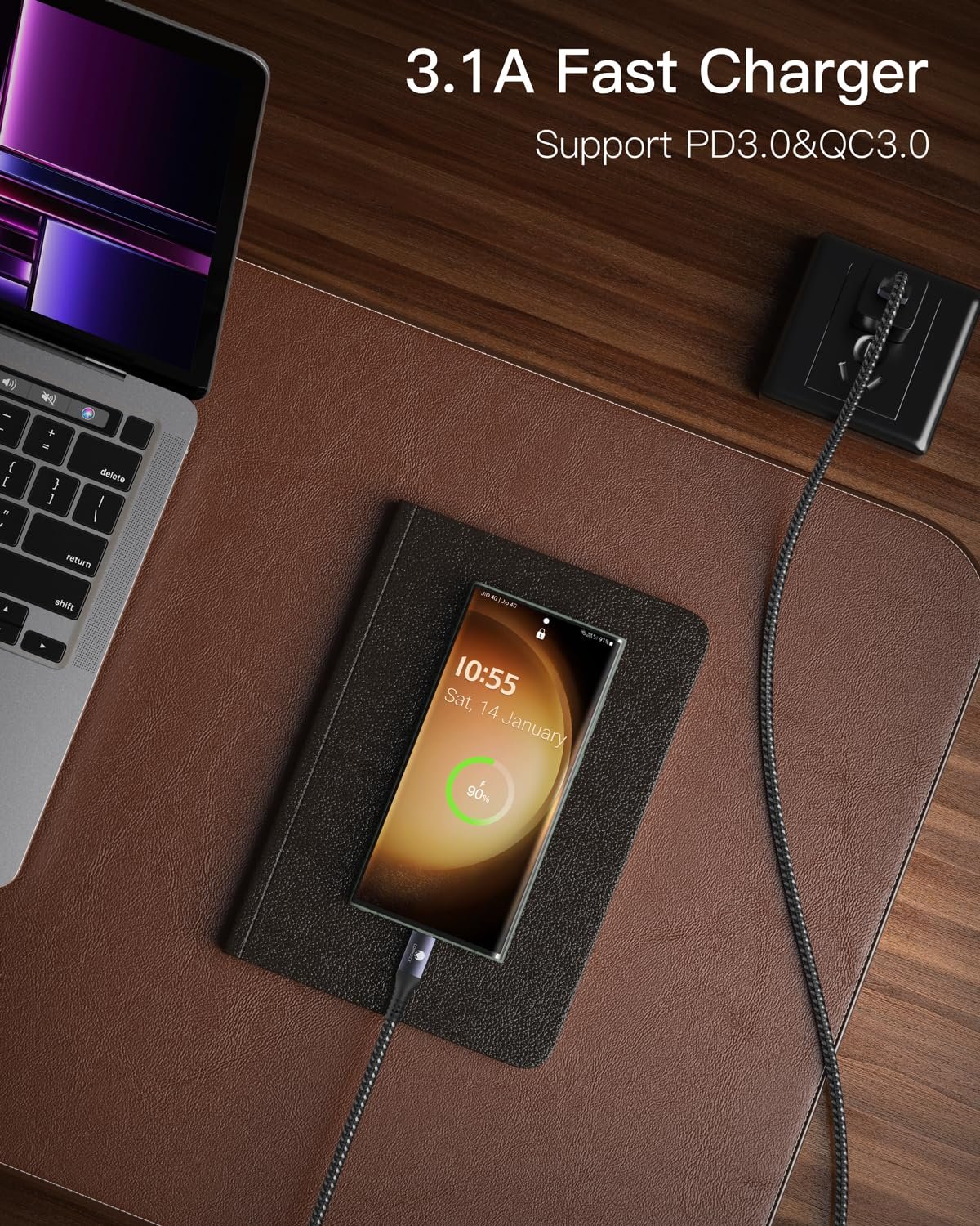 SuperSpeed+ 3.1A Fast Charging: Experience blazing-fast charging with our USB C charger cable. It supports fast charging up to 9V/3.1A, delivering a 40% faster charging speed compared to other cables that provide only 5V/2.4A output. Say goodbye to long charging times and get back to what matters most