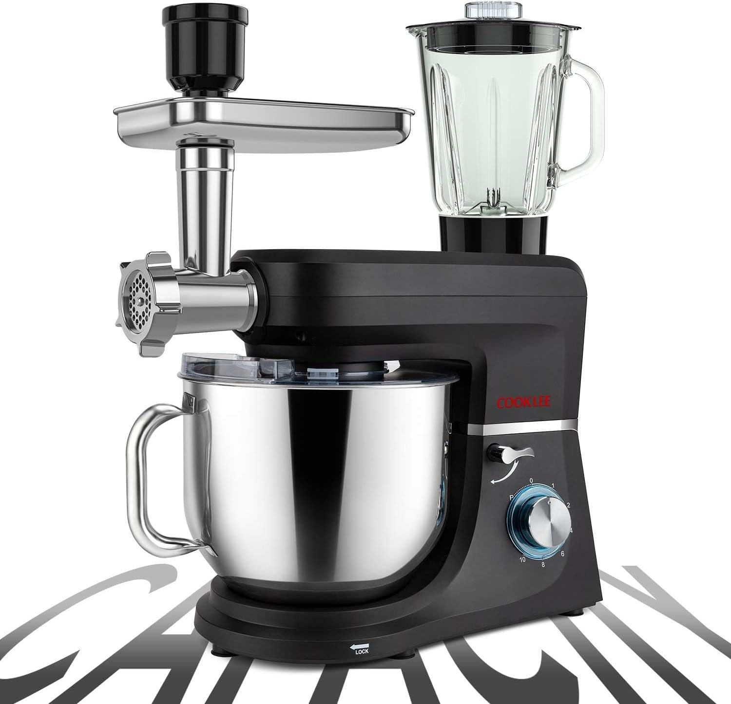 8.5-QUART HIGH CAPACITY—The large stainless steel mixing bowl provides enough capacity to meet most of your kitchen needs. Each COOKLEE kitchen stand mixer is equipped with dough hook, flat beater, wire whip, and pouring shield avoiding mess kneading process