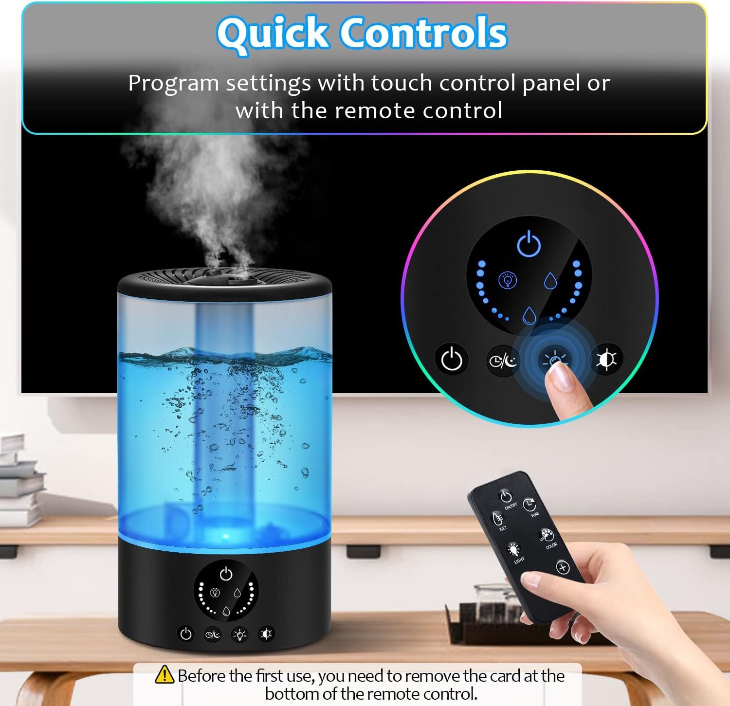 【Remote Control & Timer】 Easily adjust the humidifier settings from across the room with convenient remote control access. On a schedule? Set a 2-4-8H timer so you won’t have to worry about accidentally leaving the humidifier on