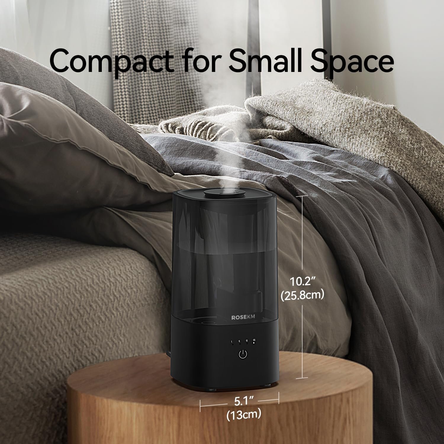 𝘾𝙤𝙢𝙥𝙖𝙘𝙩 & 𝙎𝙥𝙖𝙘𝙚-𝙨𝙖𝙫𝙞𝙣𝙜: Measuring just 5.1 inches in length and width, this humidifier fits perfectly on a nightstand without taking up much space. Ideal for bedrooms, small rooms, and apartments, its unobtrusive design ensures it blends seamlessly into any space.