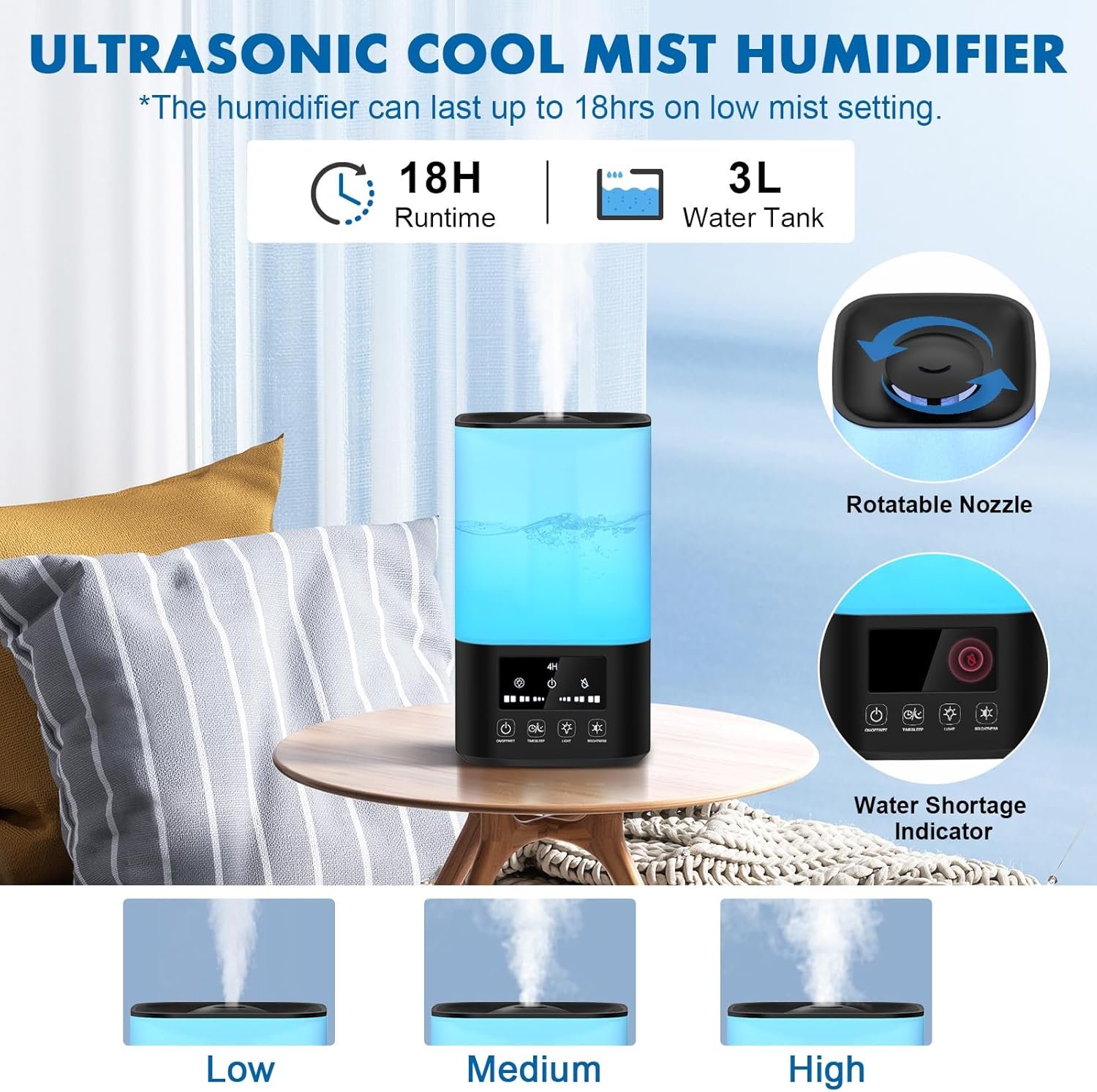 【LONG-LASTING & AUTO SHUT-OFF】Design with 3L capacity for large room, the bedroom humidifier can quietly run for 18 hours of continuous use on low setting. Let you enjoy whole night sleep, farewell to frequent adding water. The vaporizer humidifier will automatically shut off with red light on when it runs out of water or the tank is removed to ensure your safety and preventing unit damage. Additionally, equipped remote control allows you to adjust the humidifier from across the room.