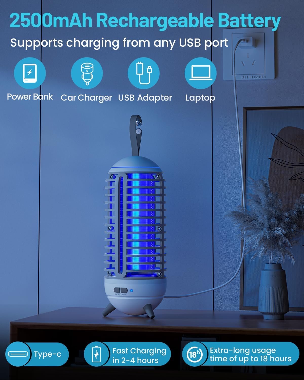2500mAh High-Capacity Battery: The bug zapper’s high-capacity battery is rechargeable via Type-C and offers up to 18 hours of operation on a single charge. This means you can use fly zapper wireless and place it wherever needed without being tethered to an electrical outlet.