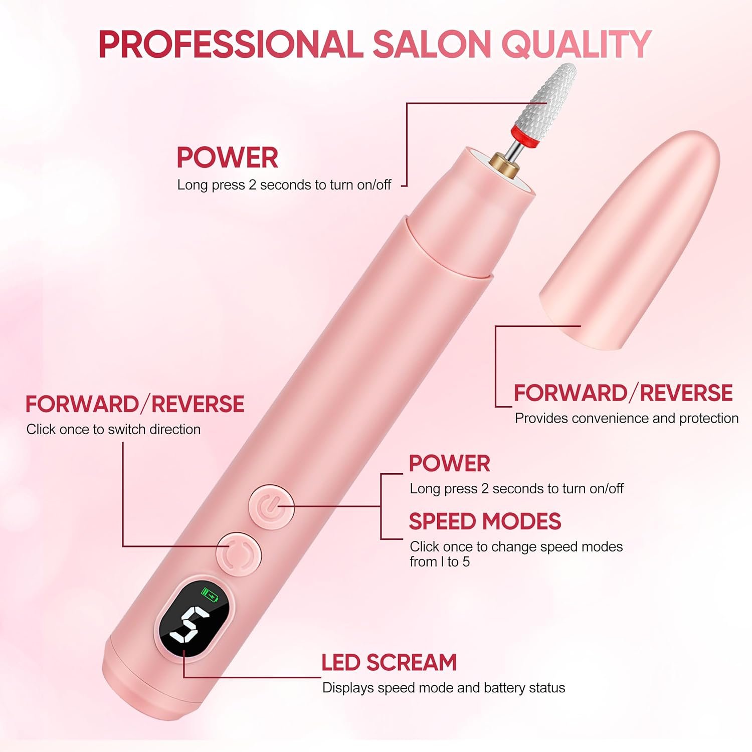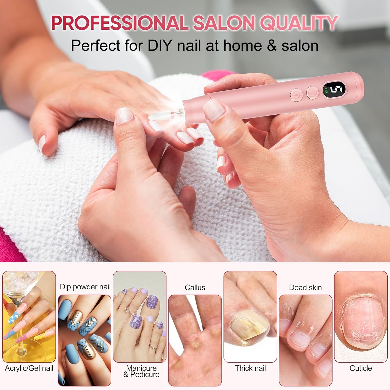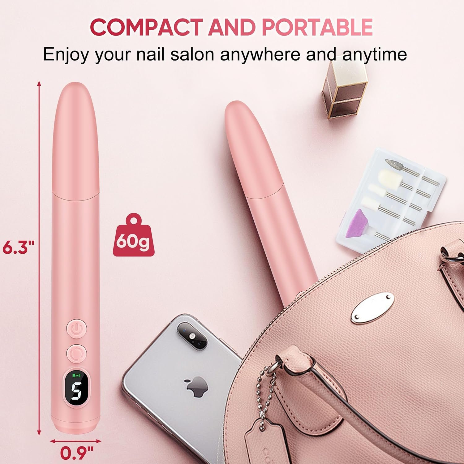 Portable & Durable: The portable nail drill is super lightweight, only 2oz, and easy to use and carry. Its pen-shaped design also makes it comfortable to hold and use, perfect for beginners. It features a protective cover and smart jam protection: it auto-pauses and shuts down after three failed attempts to prevent damage and ensure safety