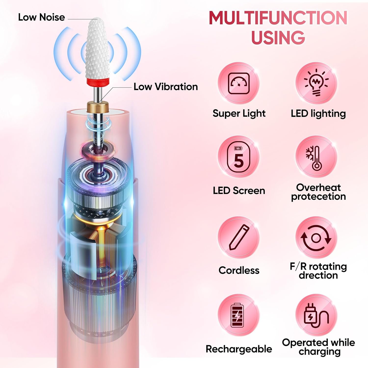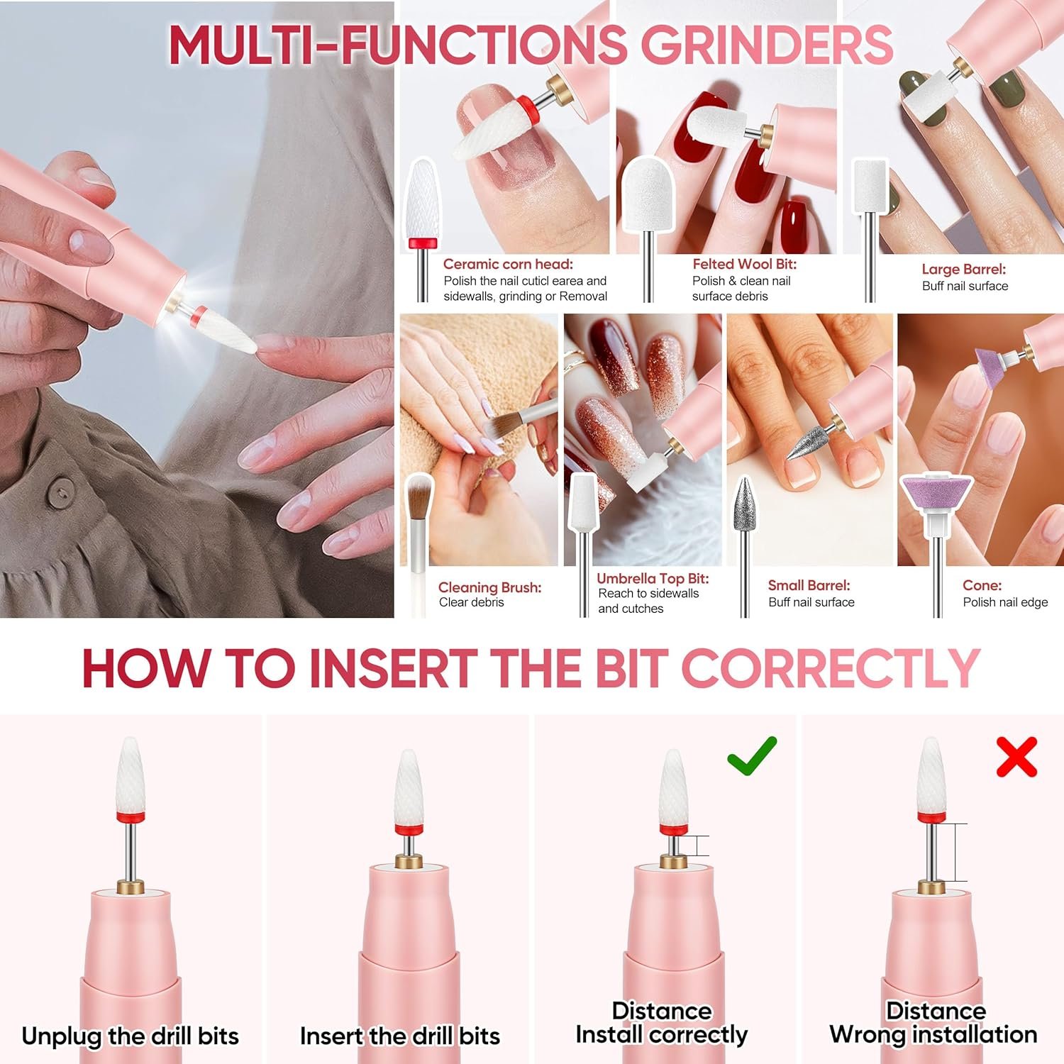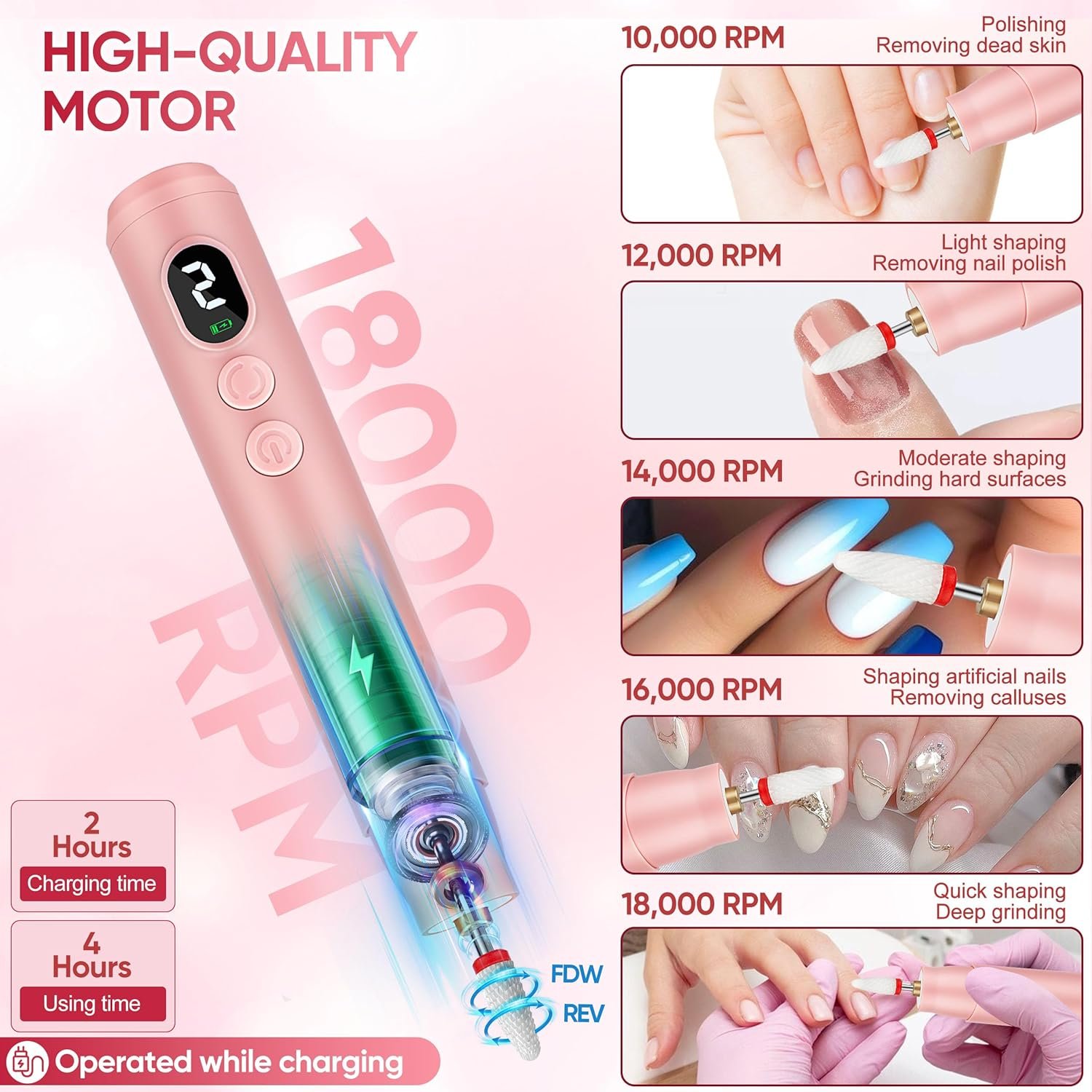 Portable & Durable: The portable nail drill is super lightweight, only 2oz, and easy to use and carry. Its pen-shaped design also makes it comfortable to hold and use, perfect for beginners. It features a protective cover and smart jam protection: it auto-pauses and shuts down after three failed attempts to prevent damage and ensure safety