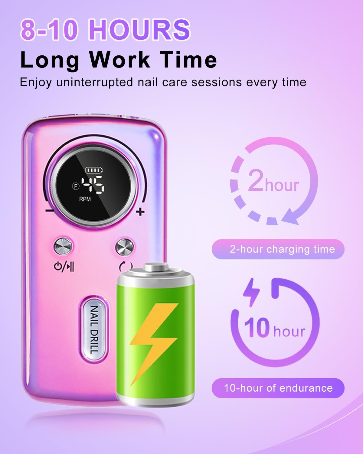 【8-10 Hours Long Work Time】Enjoy uninterrupted nail care sessions with our rechargeable nail drill, offering an impressive 8-10 hours of continuous operation on a single charge. Ideal for busy salon environments or long at-home nail treatments, ensuring consistent, reliable performance every time.