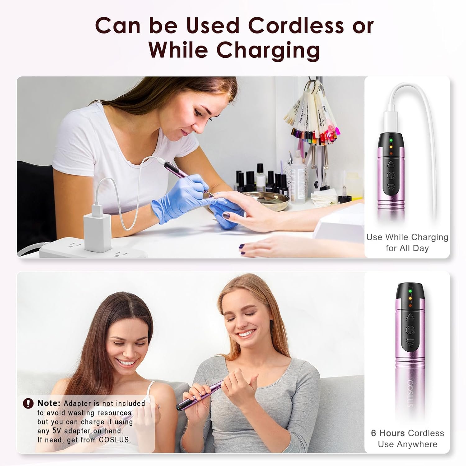 Professional Nail Drill Kit, Ideal Choice: If you have friends or lovers who is keen on nail art, this cordless electric nail drill kit is an excellent gift option. It with 6 different nail drill bits and plenty of sanding bands, catering to diverse needs and preferences.Note: Adapter is not included to avoid wasting resources, but you can charge it using any 5V adapter on hand. If need, get from COSLUS