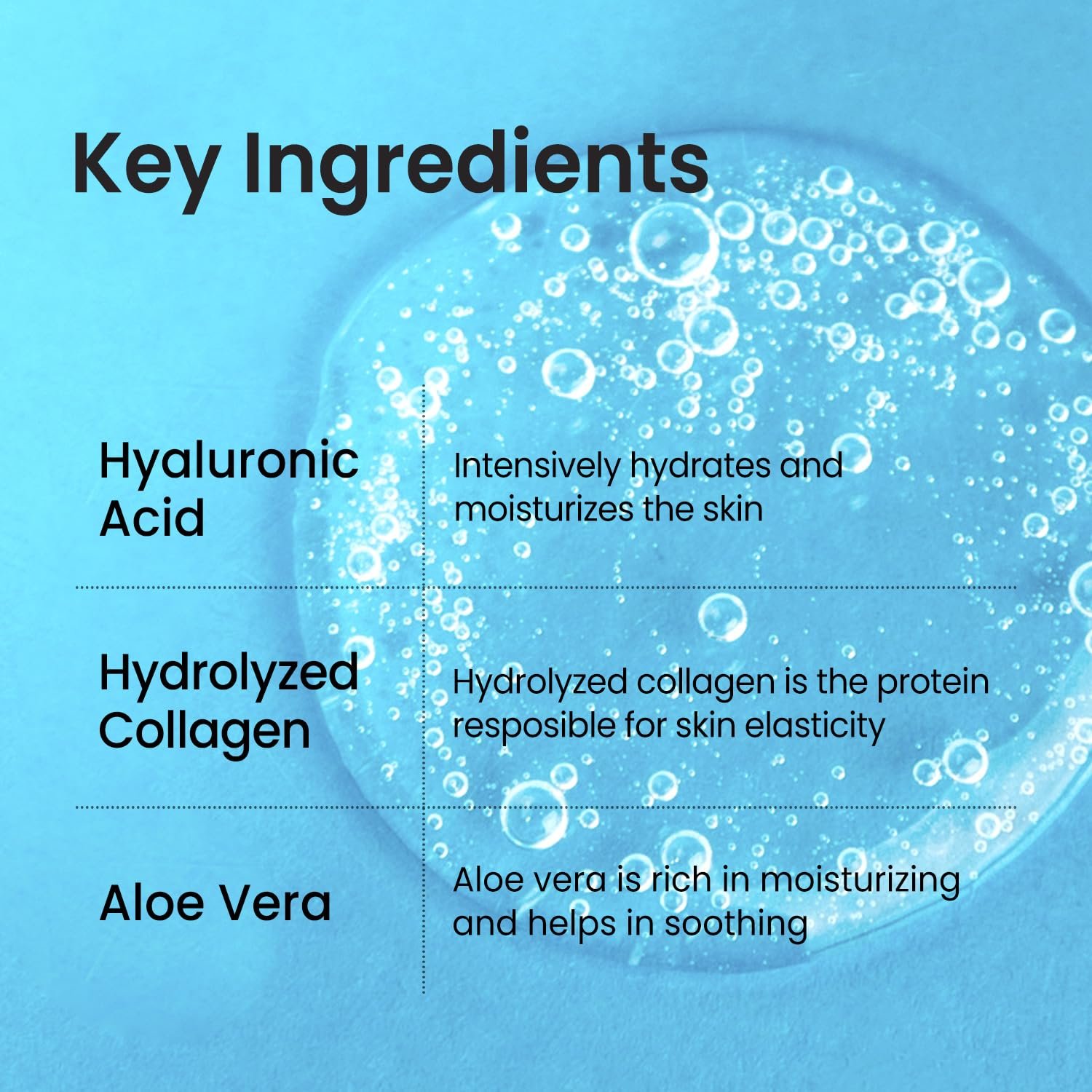 [Key Ingredients] 40% of Hyaluronic acid + Hydrolyzed Collagen+ Panthenol (B5)+ Allantoin + CICA+ PLANT COMPLEX 6 -Hyaluronic acid hydrates dehydrated skin and keep moisture barrier in skin – Pantheno hydrates dry, damaged and sensitive skin – Collagen firm and nourishes skin – Allantoin soothes red and irritated skin (Blemishes)