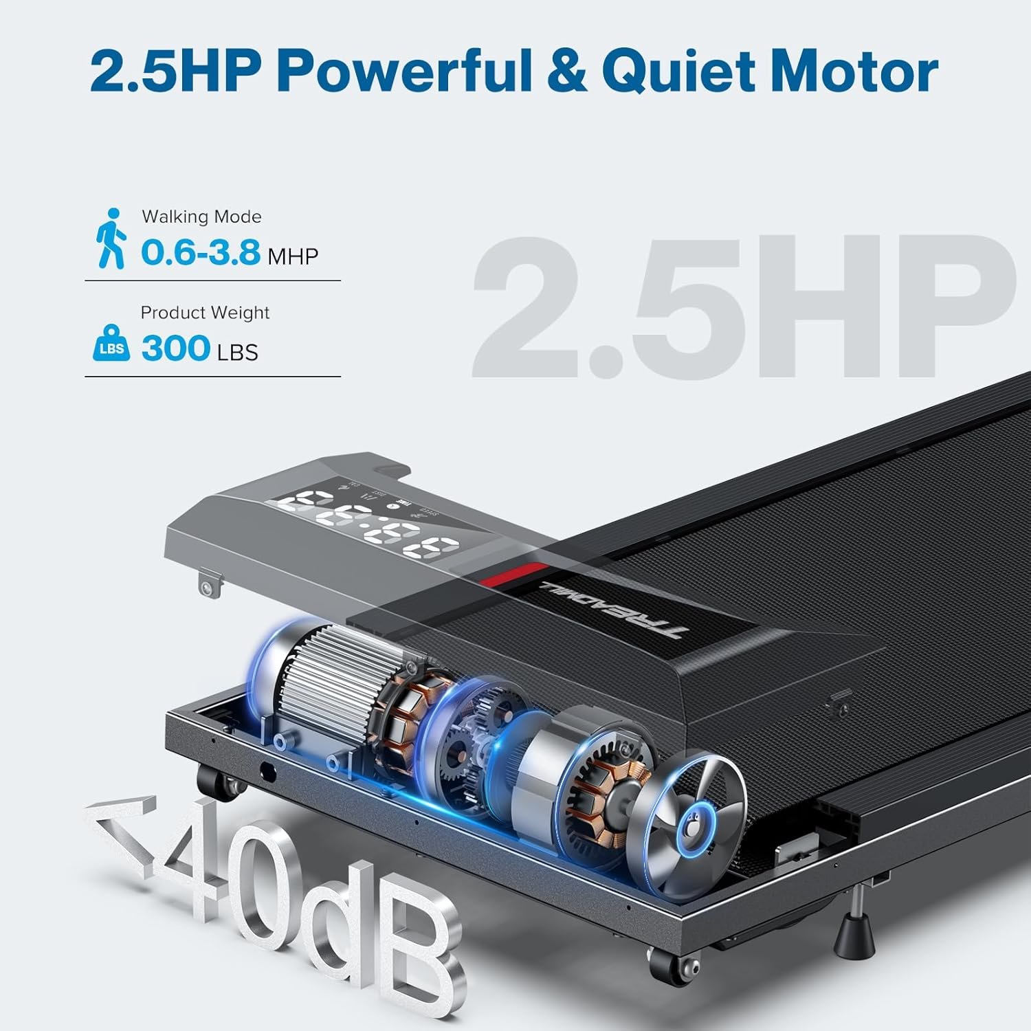 2.5HP Powerful Silent Motor: Equipped with a 2.5HP motor, the walking pad is robust and sturdy and able to provide a large carrying capacity of up to 300 lbs. Plus, it supports the speed range from 0.6mph to 3.8mph to freely switch between walking and running to meet different exercise needs. The quiet under desk treadmill allows exercising anytime, anywhere at home or in the office without any disruptive noise to disturb colleagues and neighbors.