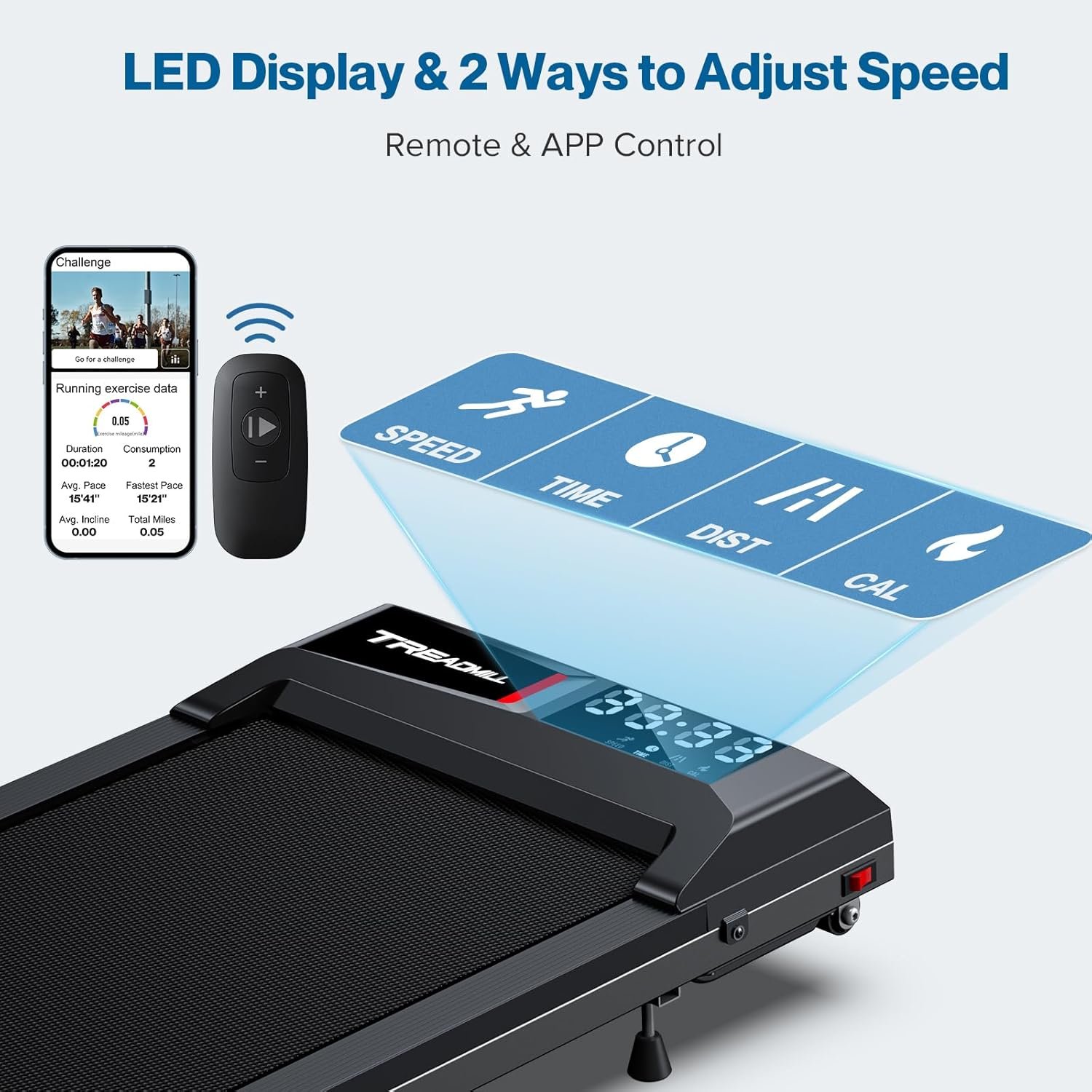 LED Display & Remote Control: Stay informed about workout progress with LED display of the portable treadmill. It simultaneously shows to track speed, distance, time and calories in real time, it could easily adjust the speed by the super handy remote control to achieve different movements. Furthermore, its sleek design and durable construction make the treadmill a high-quality addition to your home office setup.