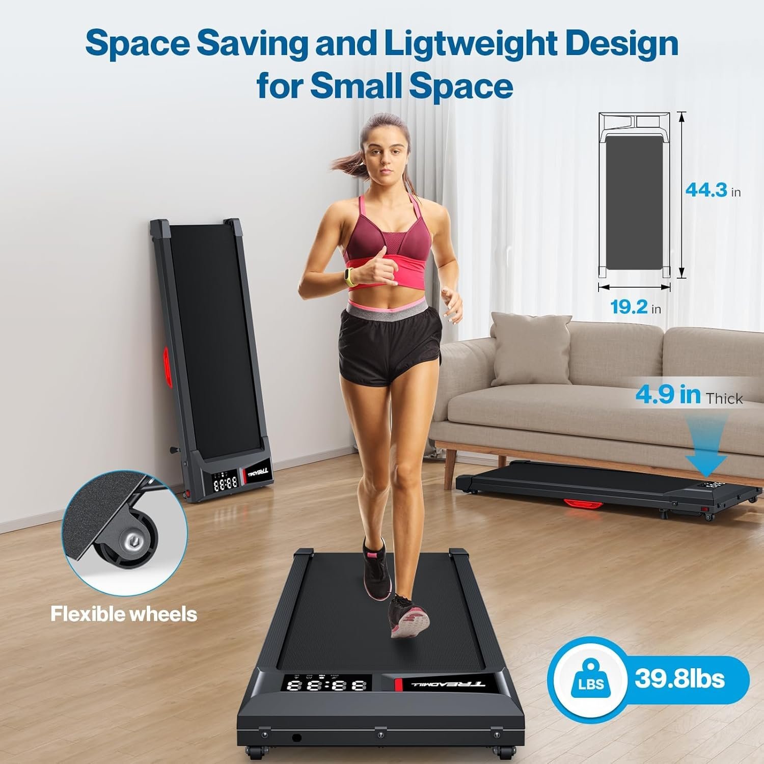 No Assembly & Space Saving: No need to install, the compact treadmill is right out of the box. Depend on space-saving and lightweight design, the thickness of slim flat under desk walking pad is only 44.3″ x 19.2″ x 4.9” and weighs only 39.8lbs, could be laid under working desk, bed, sofa or limited space. The treadmill mat could be stored vertically as well. Moreover, included Flexible wheels offer easy movement, making desk treadmill relocation effortless.