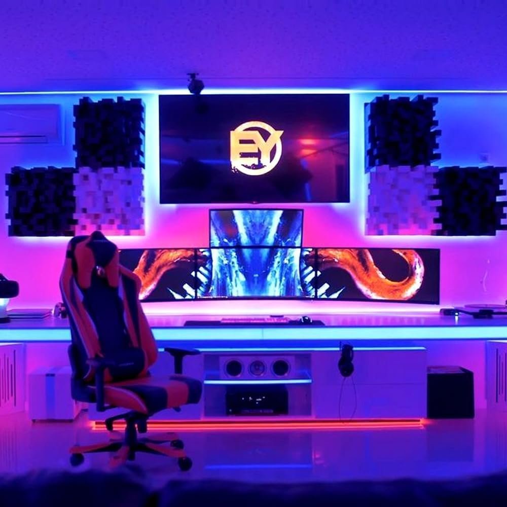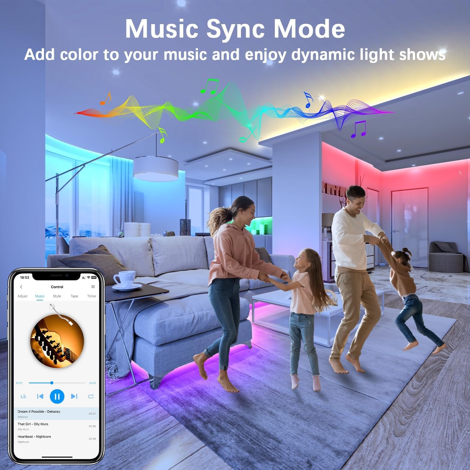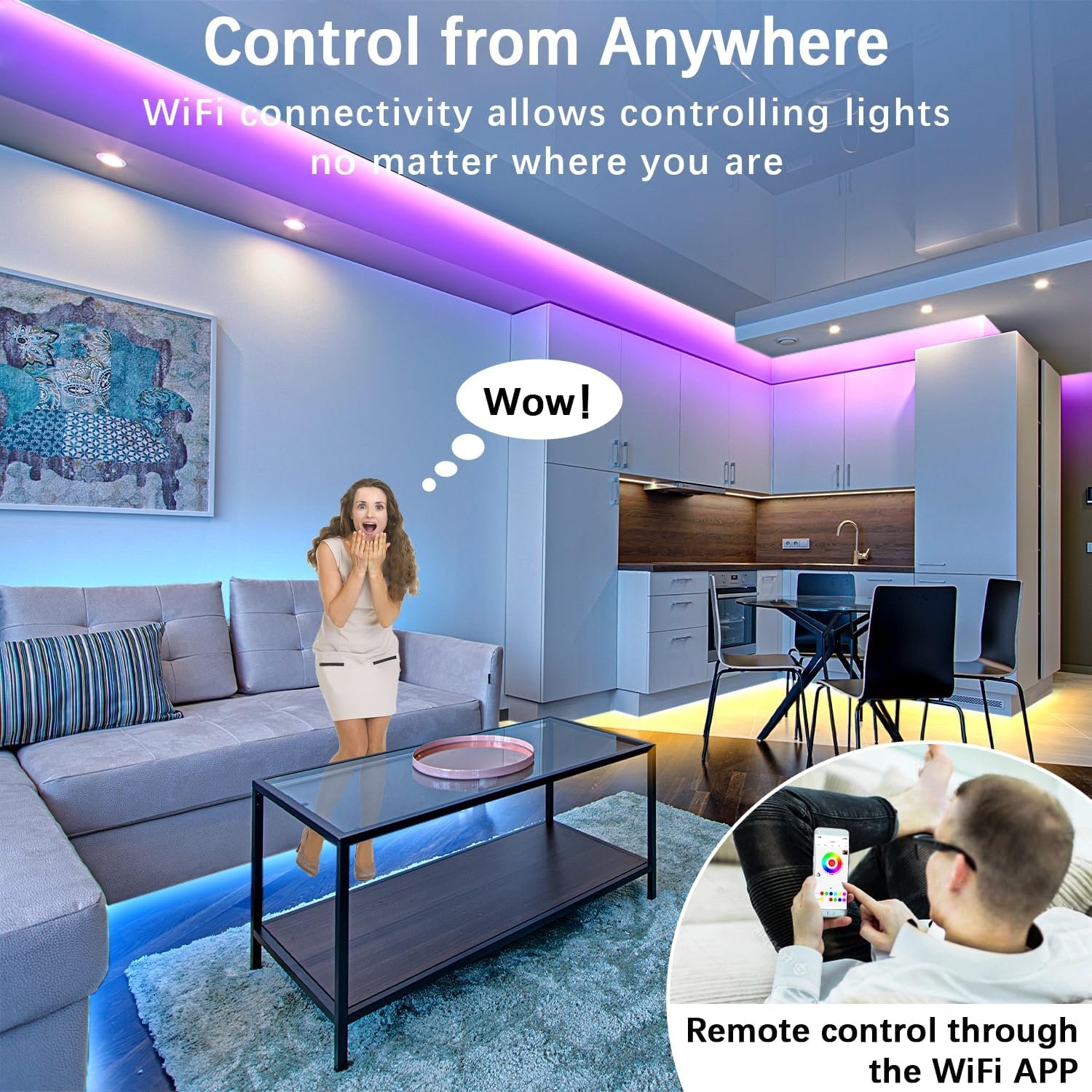 Sync to Music: Have a built-in microphone, the led light strip Change colors with the ambient sound, the lights flash along with your music beats and shows how lights changing with the rhythm . The lights for room can change color and sync with the rhythm of any sound and music.You can decorate your game room, bar bar, personal bedroom, under the stairs, etc. with smart WiFi strips!