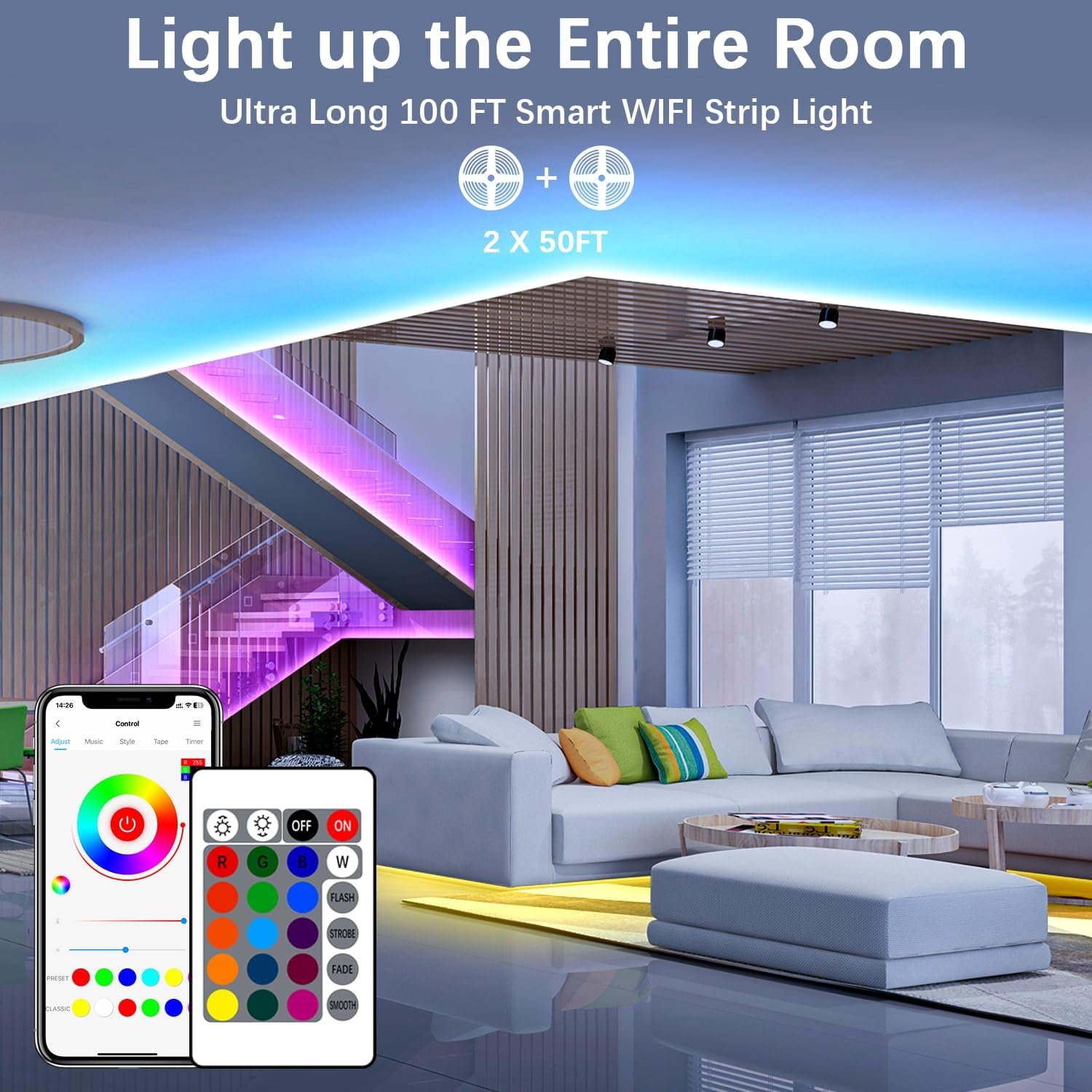 100ft(2 rolls of 50ft) Smart Led Strip Lights for Bedroom, Work with Alexa