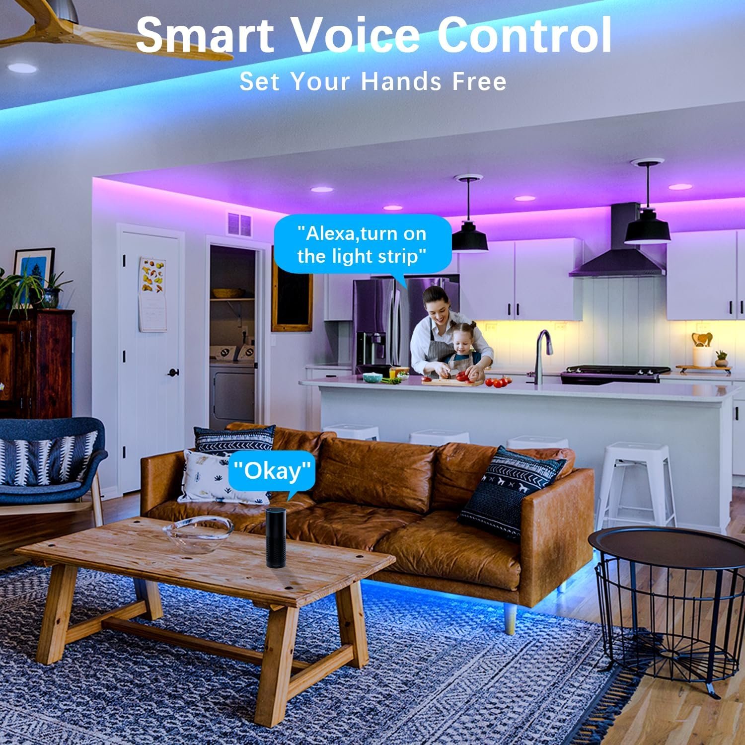 Voice & Smartphone Control:The smart led strip lights is no longer needs to be controlled by hand. It works with Alexa echo and Google assistant, you can control the functions of this led strip lights through voice, which must be controlled by remote control before. Besides, you can turn your led lights on and off, adjust color and brightness wherever you are. [Not support 5g wifi][Voice devices are not included]