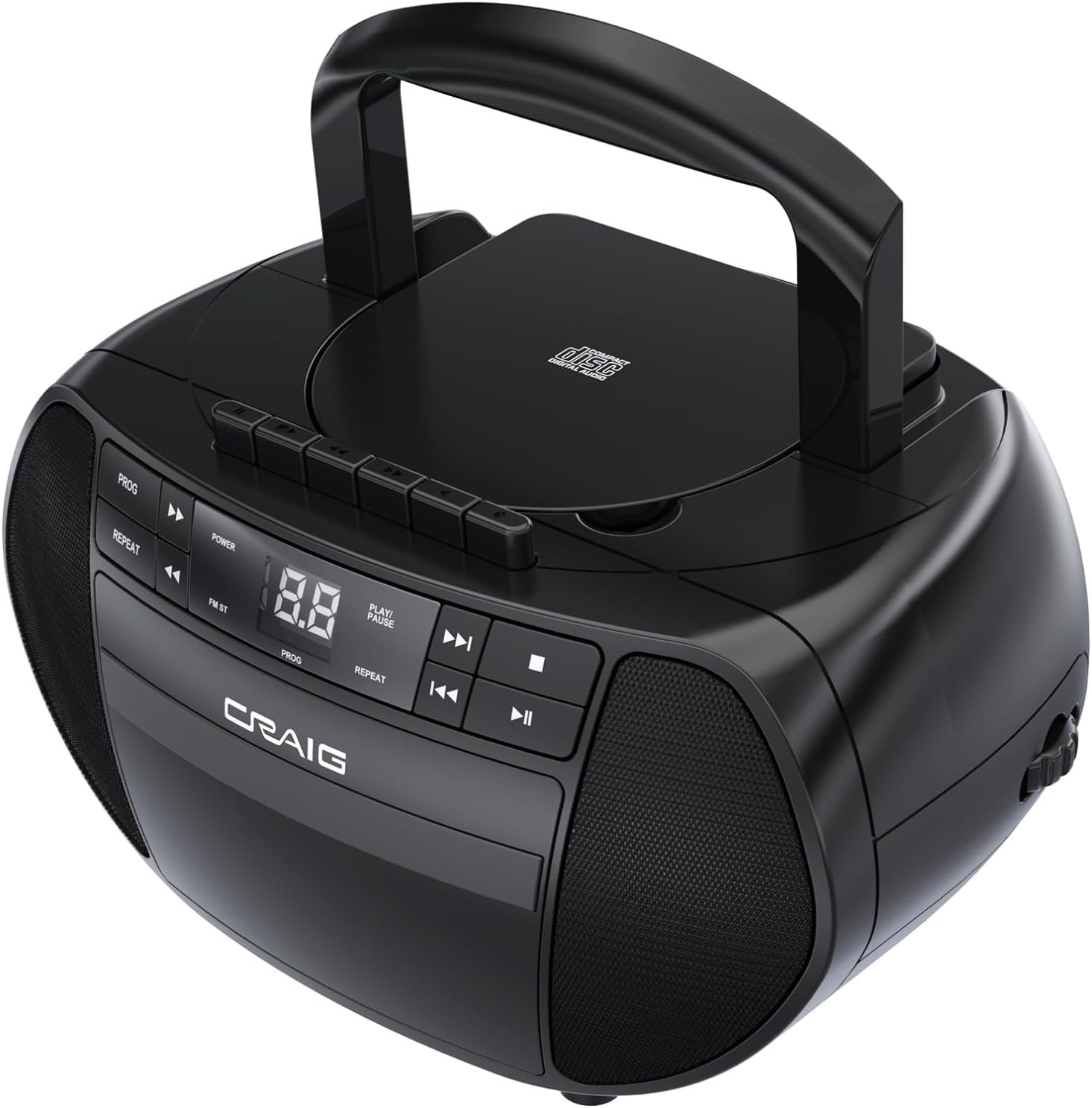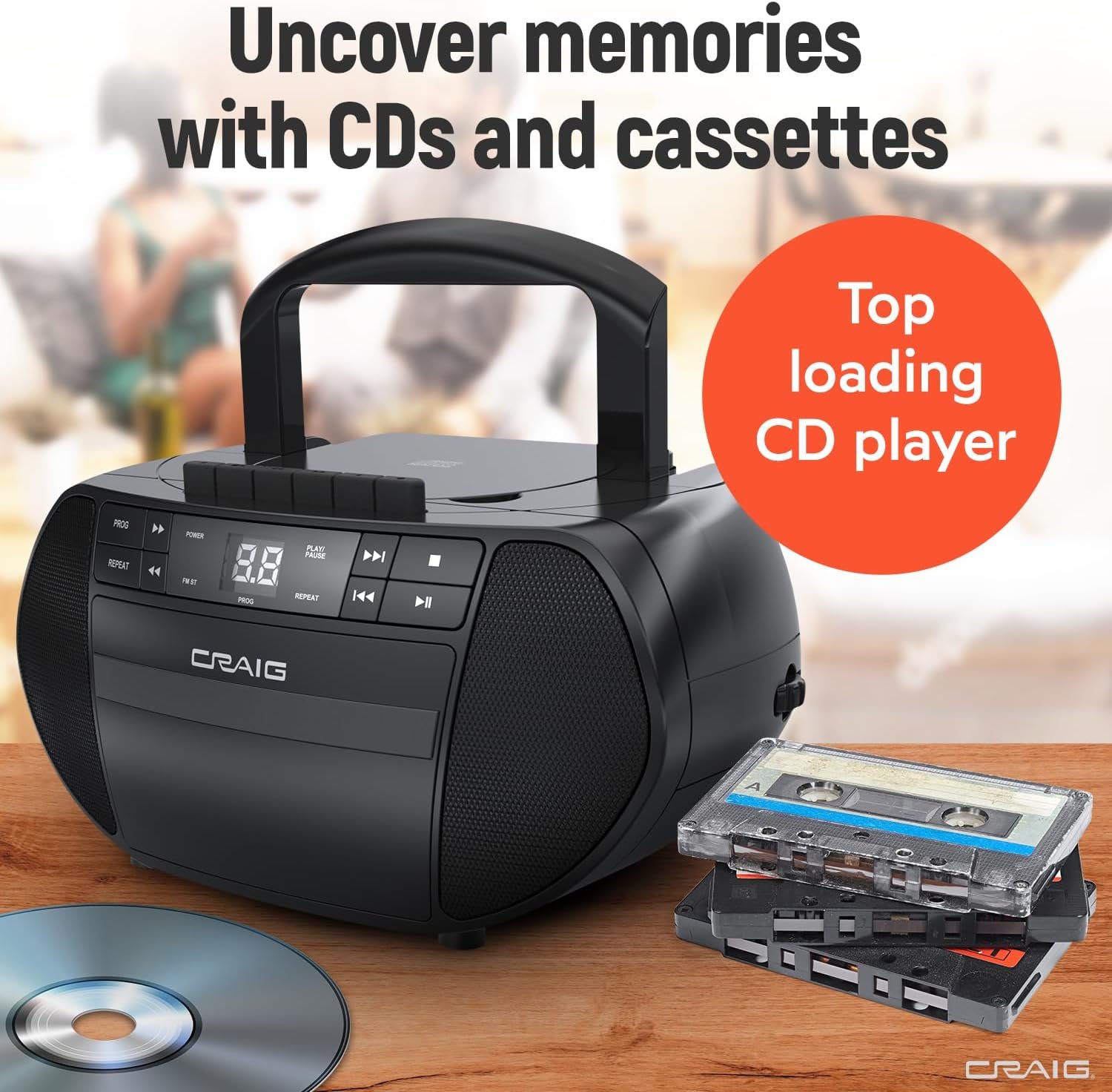 Craig Portable Top-Loading CD Boombox with AM/FM Stereo Radio and Cassette Player/Recorder in Black | Cassette Player/Recorder | LED Display (Black)