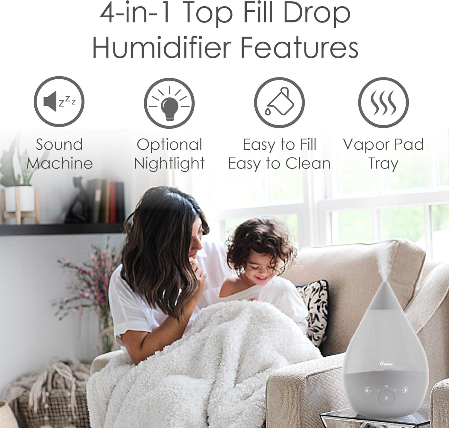 LARGE ROOM HUMIDIFIER: 4-in-1 Crane Drop Ultrasonic Humidifier features an easy-to-clean, detachable top fill tank that holds one gallon of water− perfect for humidifying indoor spaces up to 500 square feet for 24 hours
