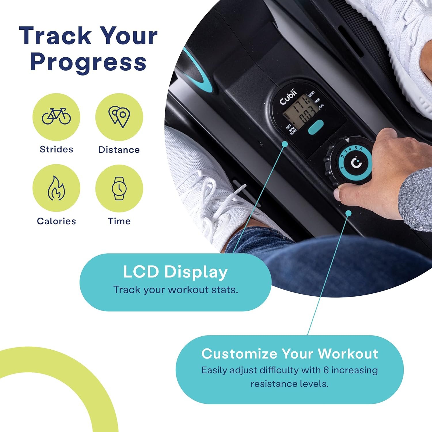 BUILT IN LCD DISPLAY PROGRESS TRACKER – The easy to read LCD monitor displays your stride count, mileage, duration, and calories burned so you can track your progress. Manually enter stats to the Cubii App for an interactive fitness experience.