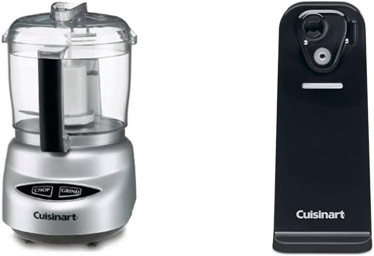 The Cuisinart Mini-Prep Plus 3 Cup Food Processor and Deluxe Electric Can Opener bundle pairs two convenient kitchen appliances to streamline food preparation. The mini food processor chops, grinds, and mixes ingredients in its 24 oz work bowl. Its 250-watt motor and auto-reversing SmartPower blade make quick work of soft or hard foods. The unit is lightweight at just over 3 lbs and features dishwasher-safe parts for easy cleanup. Complementing the mini prep’s functionality, the deluxe can opener easily opens cans of all sizes with its Power Cut blade. The sturdy opener has a wide base to prevent tipping and sliding. Its press-and-release lever allows for simple, one-touch operation. Like the food processor, the can opener disassembles for hassle-free washing. Together, this Cuisinart bundle takes on a variety of kitchen tasks – from chopping vegetables to opening cans – to save time in meal preparation.